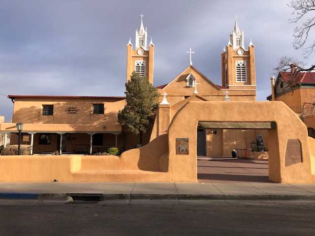 The major historical structure on the plaza’s north side is the San Felipe de Neri church. The oldest church is ABQ was founded in 1706 by a Franciscan priest. The present abode building in the shape of a cross dates from 1793 and is designated as a national historic place. The exterior features twin bell towers. Admission to the church and gift shop is free (when there are no services) with donations accepted. San Felipe de Neri Parish | Albuquerque, NM.
