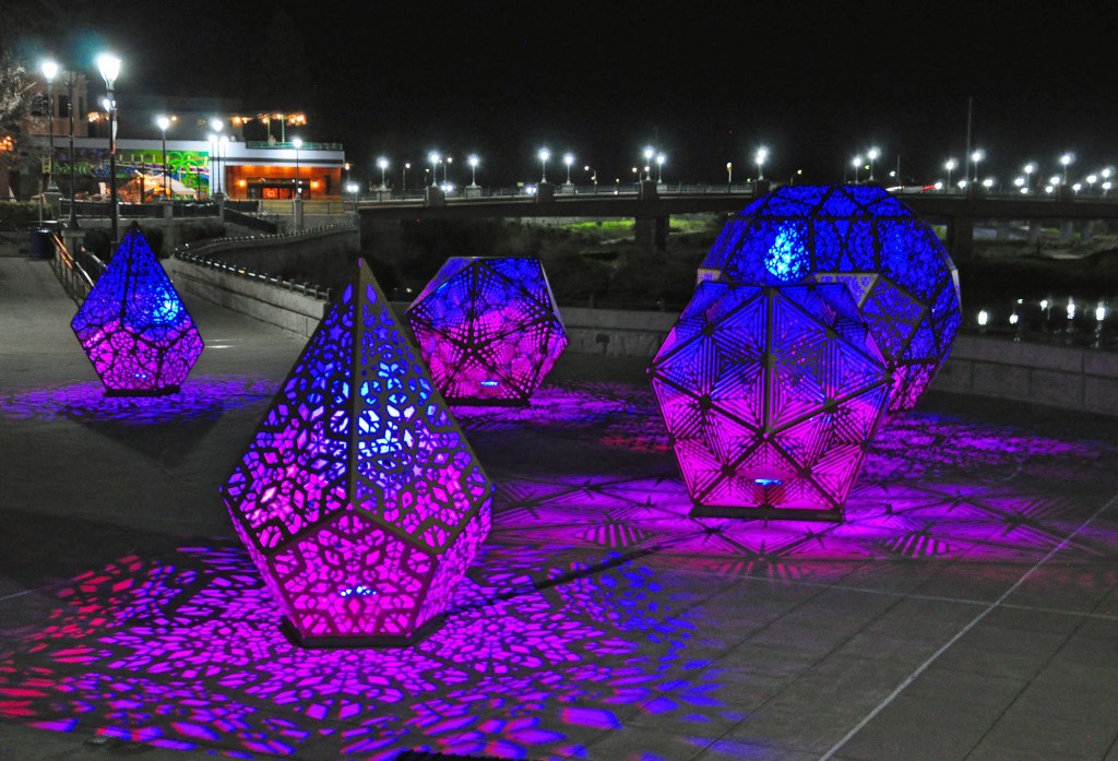At the Veterans Memorial Park on Main Street there was an impressive display of “Lightforms,” five geometrical sculptures by Yelena Filipchuk and Serge Beaulieu of Hybycozo (Los Angeles) inspired by the Buckminster Fuller’s futuristic geodesic domes.