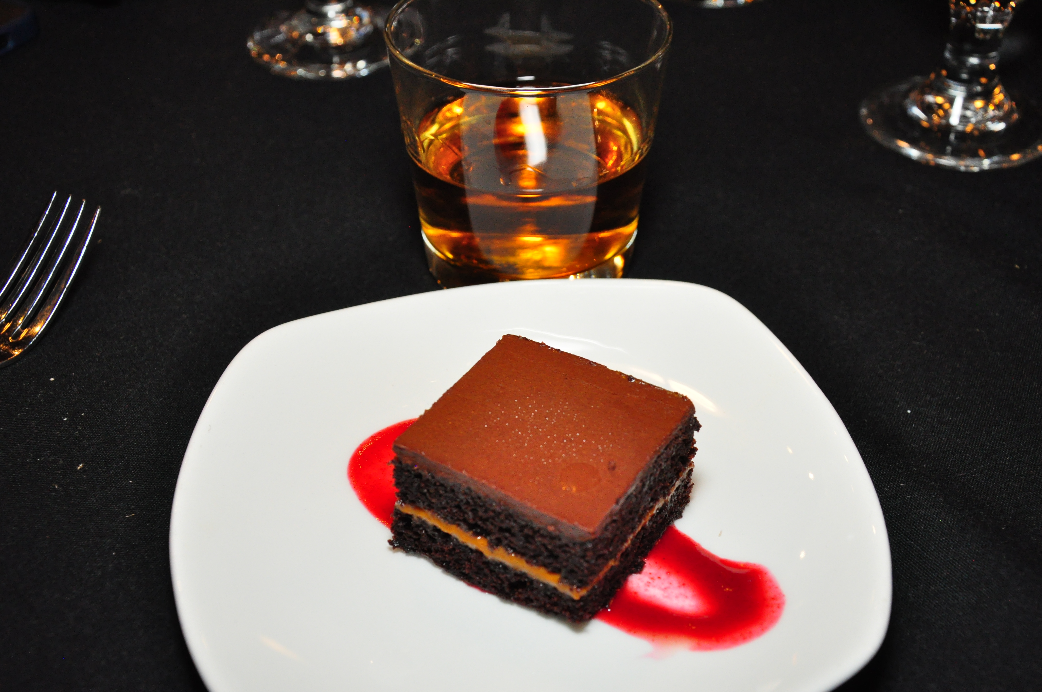 A decadent dessert of Chocolate Truffle Cake with dulce de leche filling and raspberry sauce, found a great match in smooth and bright Patrón Extra Añejo of amber-golden color, aged for at least three years in American and French oak, and served neat for a nose of dry fruit, vanilla, and banana, and a deep, nuanced oaky palate.