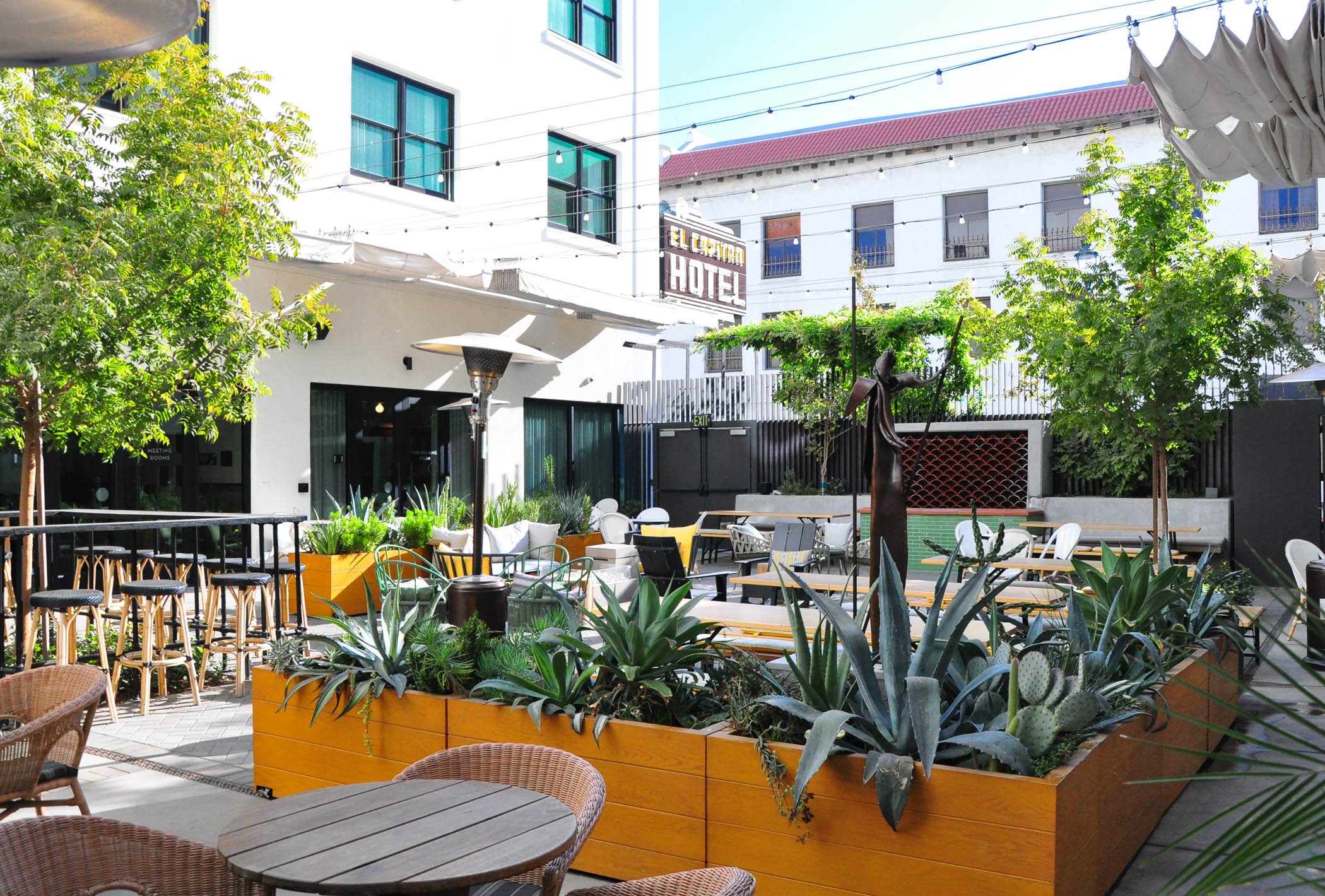 At the El Capitan Courtyard, open to the public, there’s also a wonderful bar area with great cocktails and small plates in an al fresco setting among the whimsical movable flower beds with cacti and succulents, and bronze sculptures, placed among them.