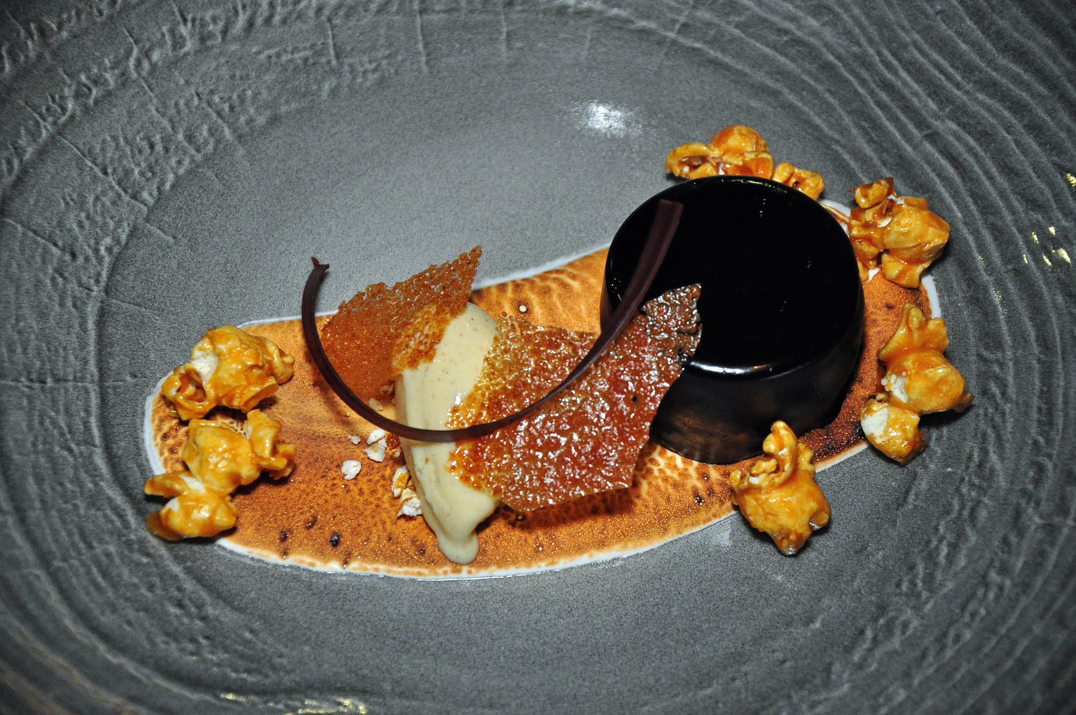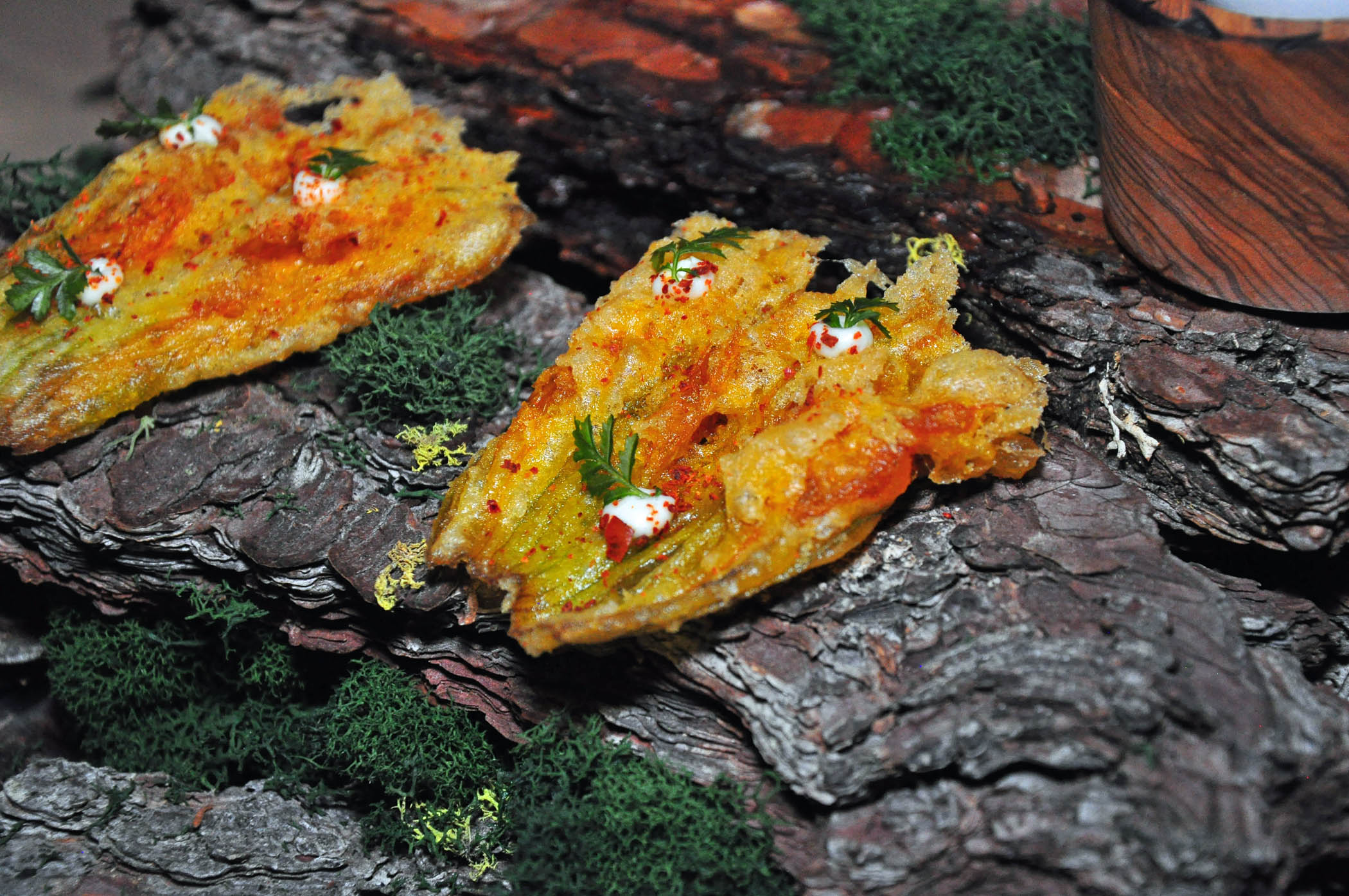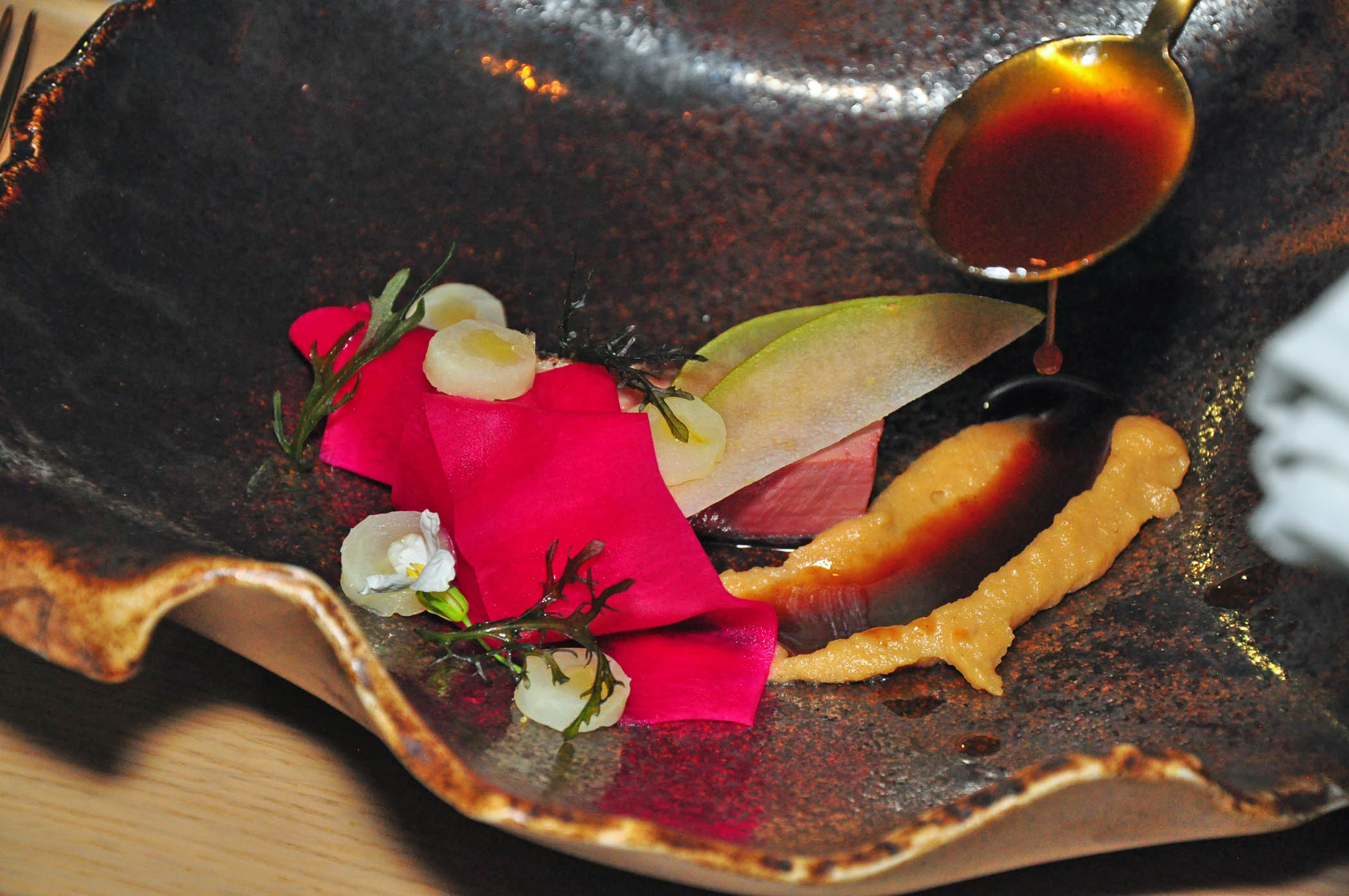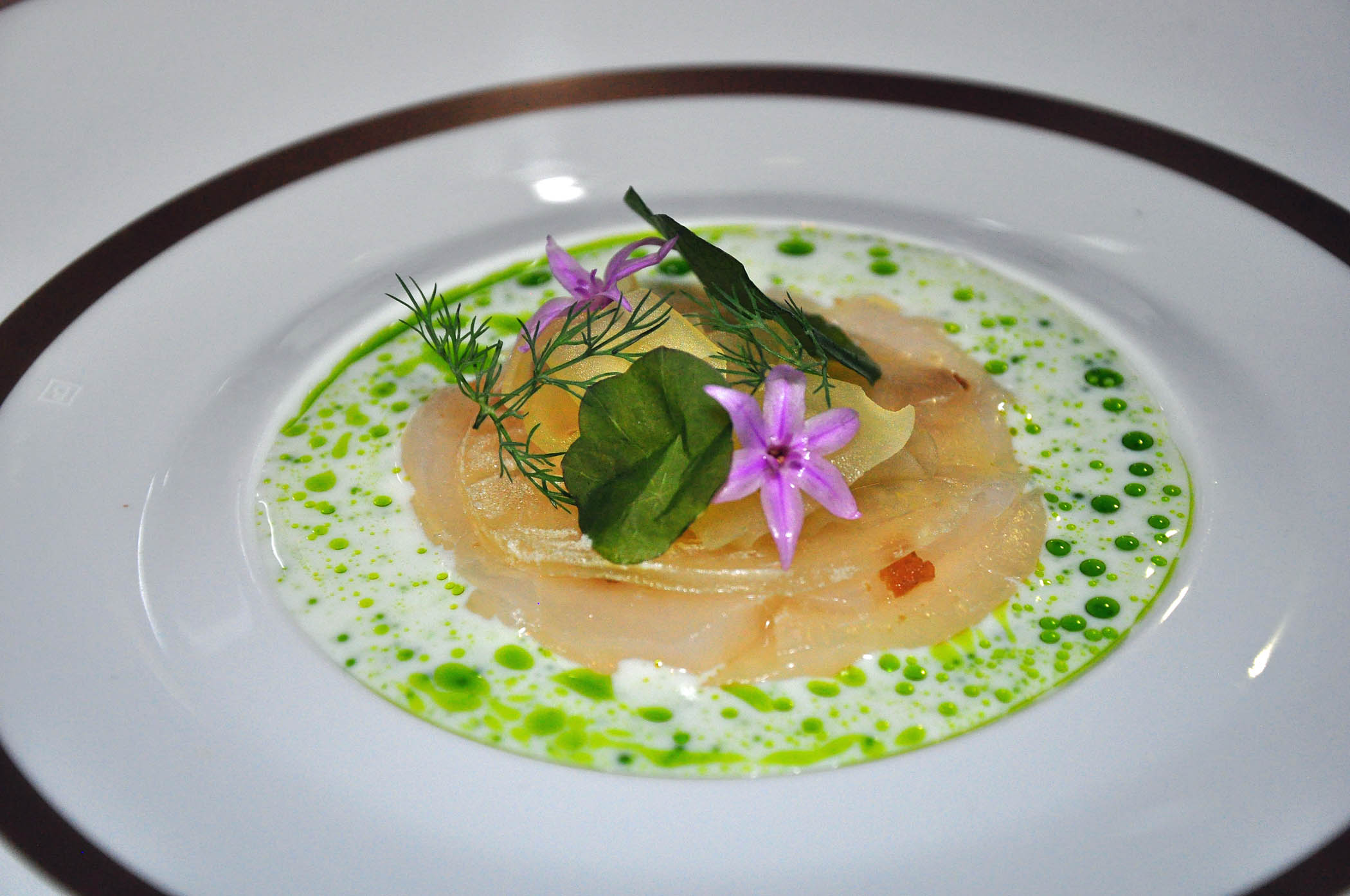 A typical Rainbird menu, paired with wine, sounds like a culinary poem, and dazzles diners with unimaginable preparations of everyday vegetables. It becomes immediately obvious that something great is about to happen on the table when at the very beginning of a lavish feast, Opolo Paso Robles sparkling wine is followed by an elaborate amuse bouche of fried squash blossoms, sprinkled with onion soubise and Aleppo pepper flakes on a pedestal of tree bark and green moss, and thin potato slices encircled in a shiny emerald on white ribbon of coriander cream, topped with delicate purple chive blossoms.