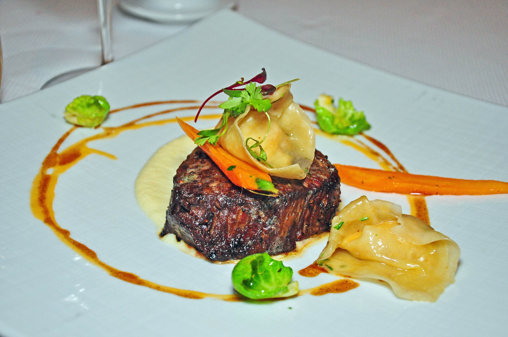 His incredibly flavorful Clothesline Candied Bacon, glazed with maple syrup and spiced with black pepper, is served hanging from a “clothesline,” indeed, garnished with a wedge of lemon and a slice of half sour pickle, while Beef Tenderloin with Lobster Dumplings presents the best of surf and turf, enhanced by a touch of seasonal veggies, celery root purée, horseradish bordelaise sauce, and lobster béarnaise.