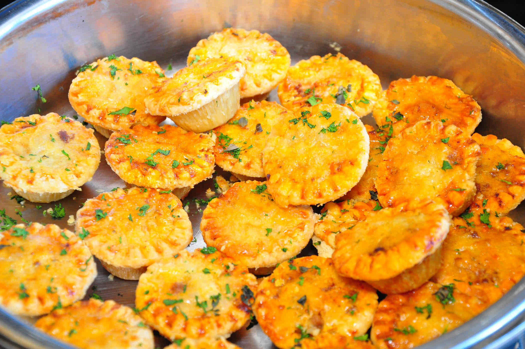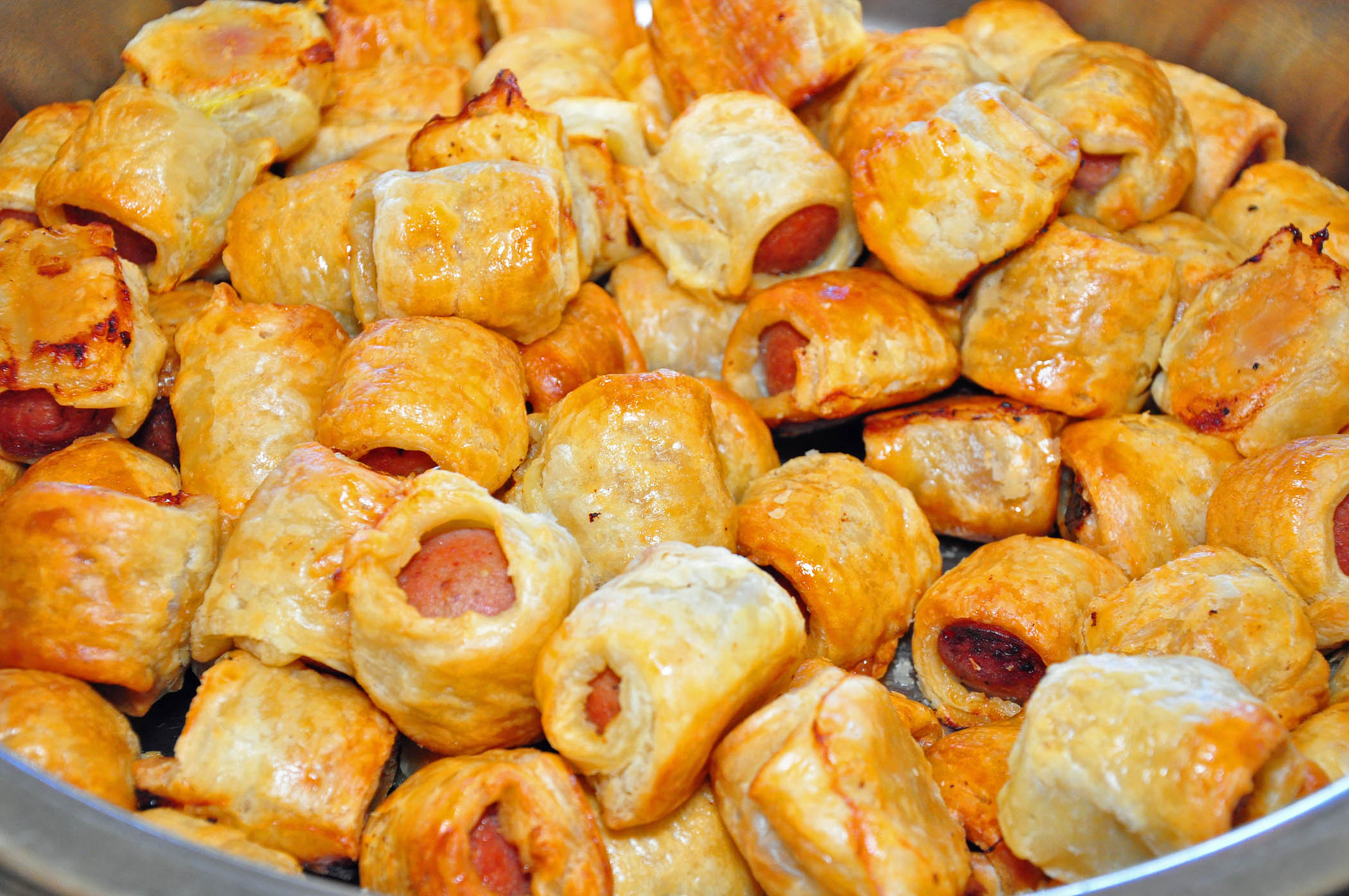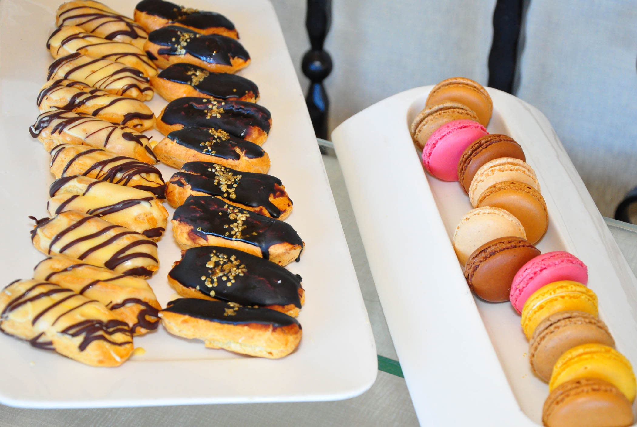 Fish and chips, sliders (mini-burgers), empanadas (Latin American turnovers), gyoza (Japanese potstickers), fried plantains, pigs in a blanket (tiny hot dogs wrapped in pastry), and other finger foods were followed by mini eclairs, French macarons, glazed doughnuts, and one-bite sweet pies.