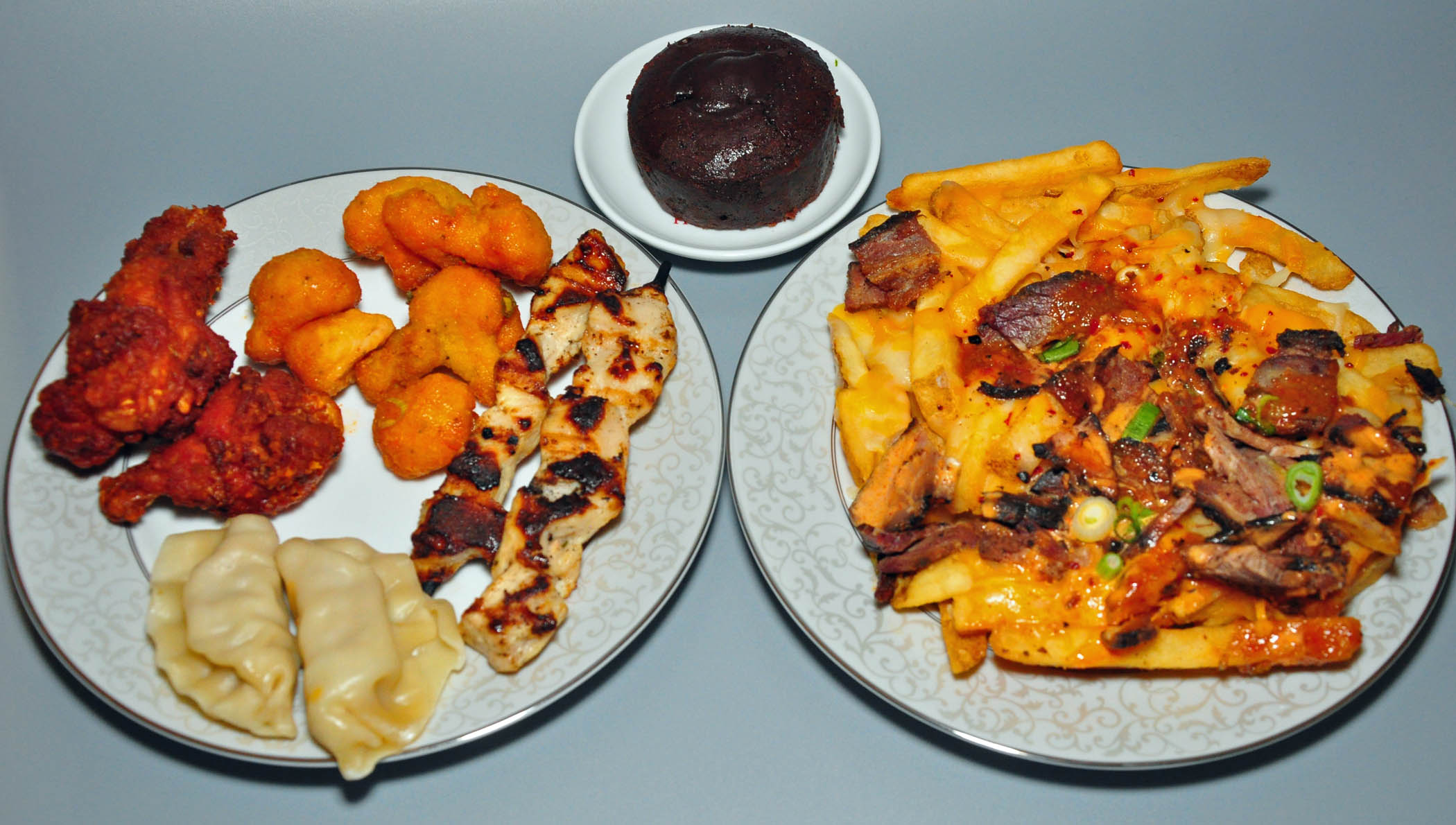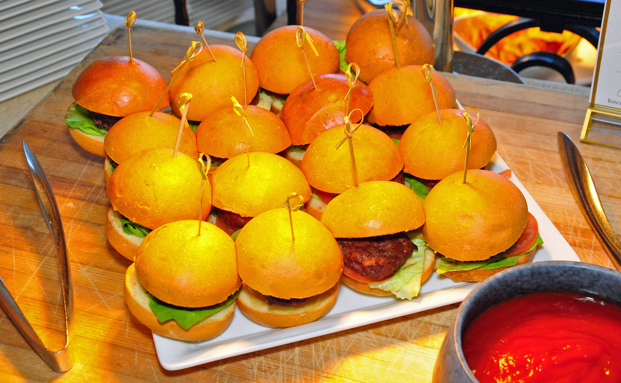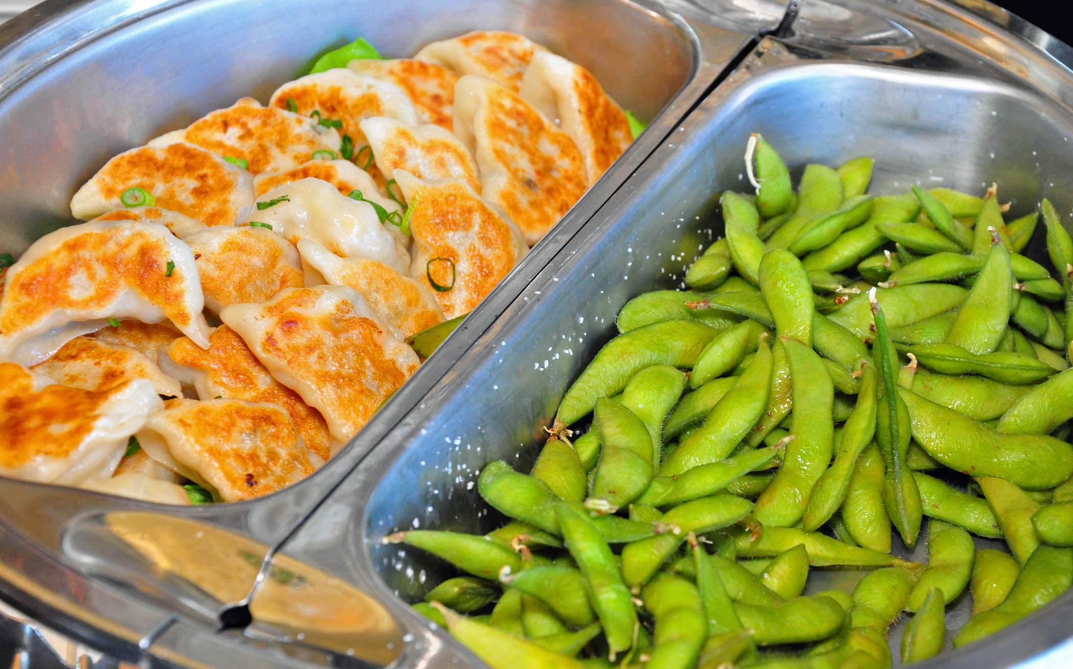 Fish and chips, sliders (mini-burgers), empanadas (Latin American turnovers), gyoza (Japanese potstickers), fried plantains, pigs in a blanket (tiny hot dogs wrapped in pastry), and other finger foods were followed by mini eclairs, French macarons, glazed doughnuts, and one-bite sweet pies.