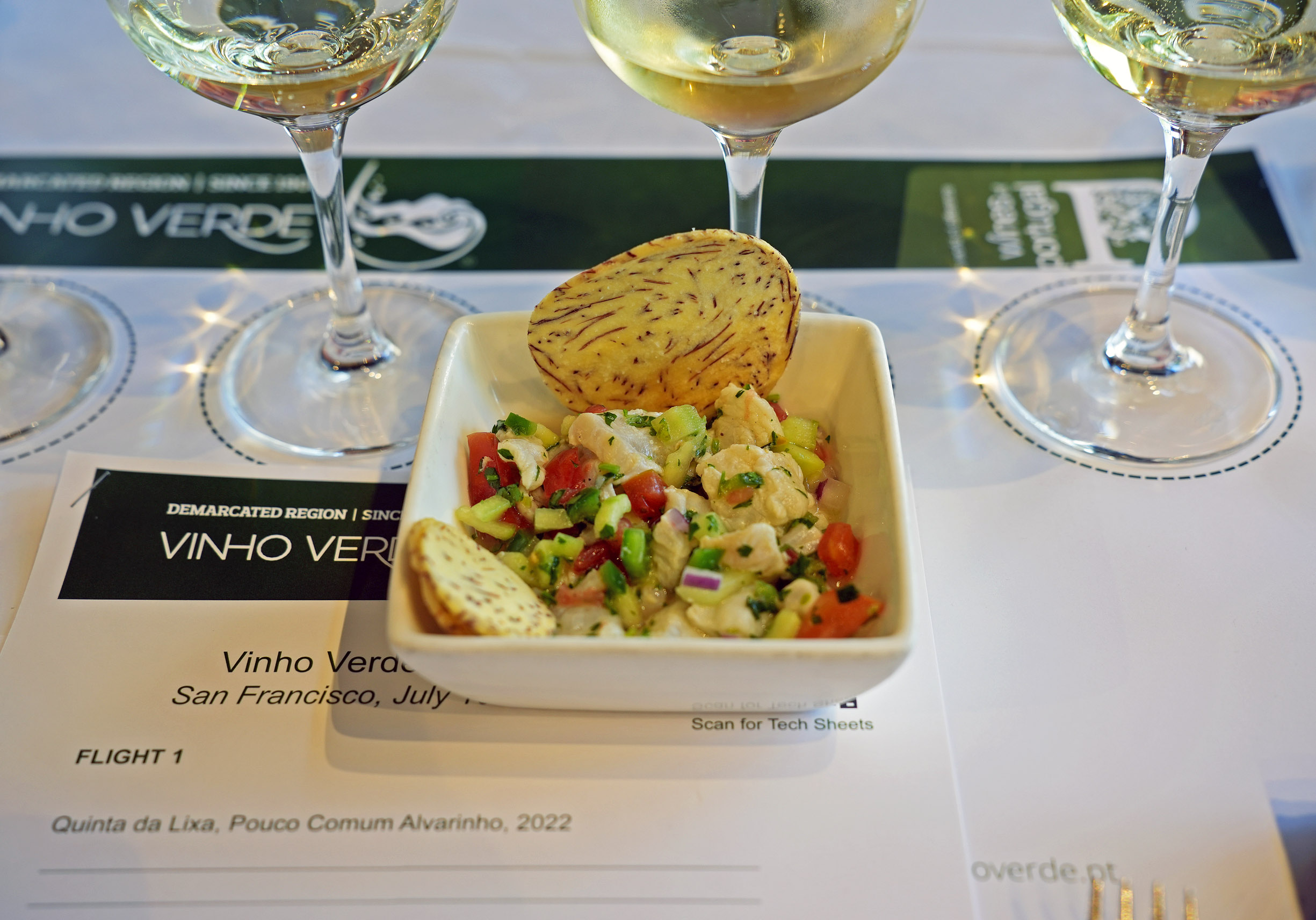 Flight 1 Quinta da Lixa, Pouco Comum Alvarinho 2022, Adega Ponte de Lima, Colheita Selecionada Loureiro, 2022, A & D Wines, Monologo Avesso, 2022, and Adega Ponte de Barca Estreia Premium 2022 were paired with Halibut Ceviche with taro chips.