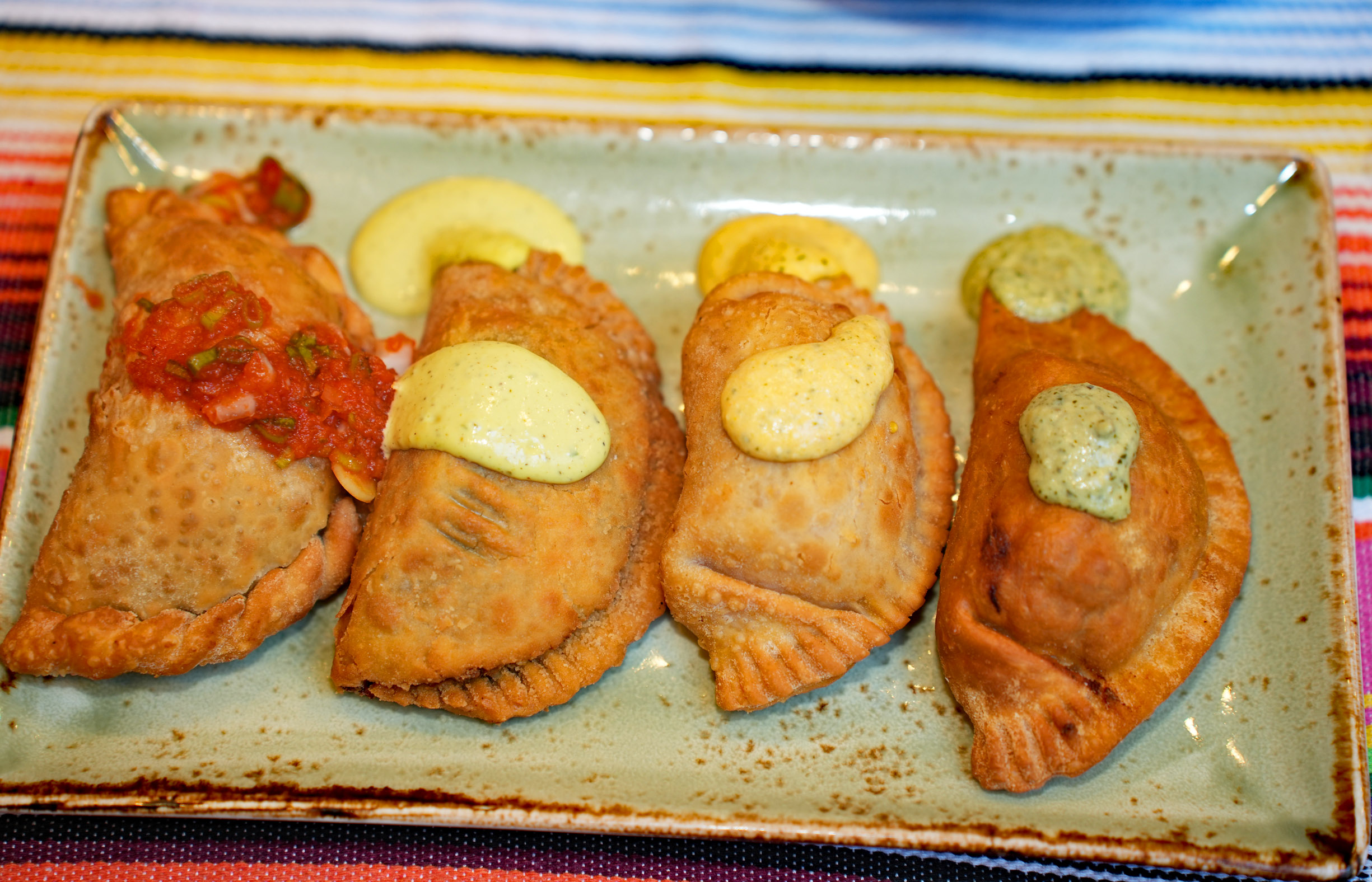 Highly recommended Empanadas Sampler includes four empanadas with different stuffing (beef, chicken, mushrooms, and cheese) with corresponding sauces.