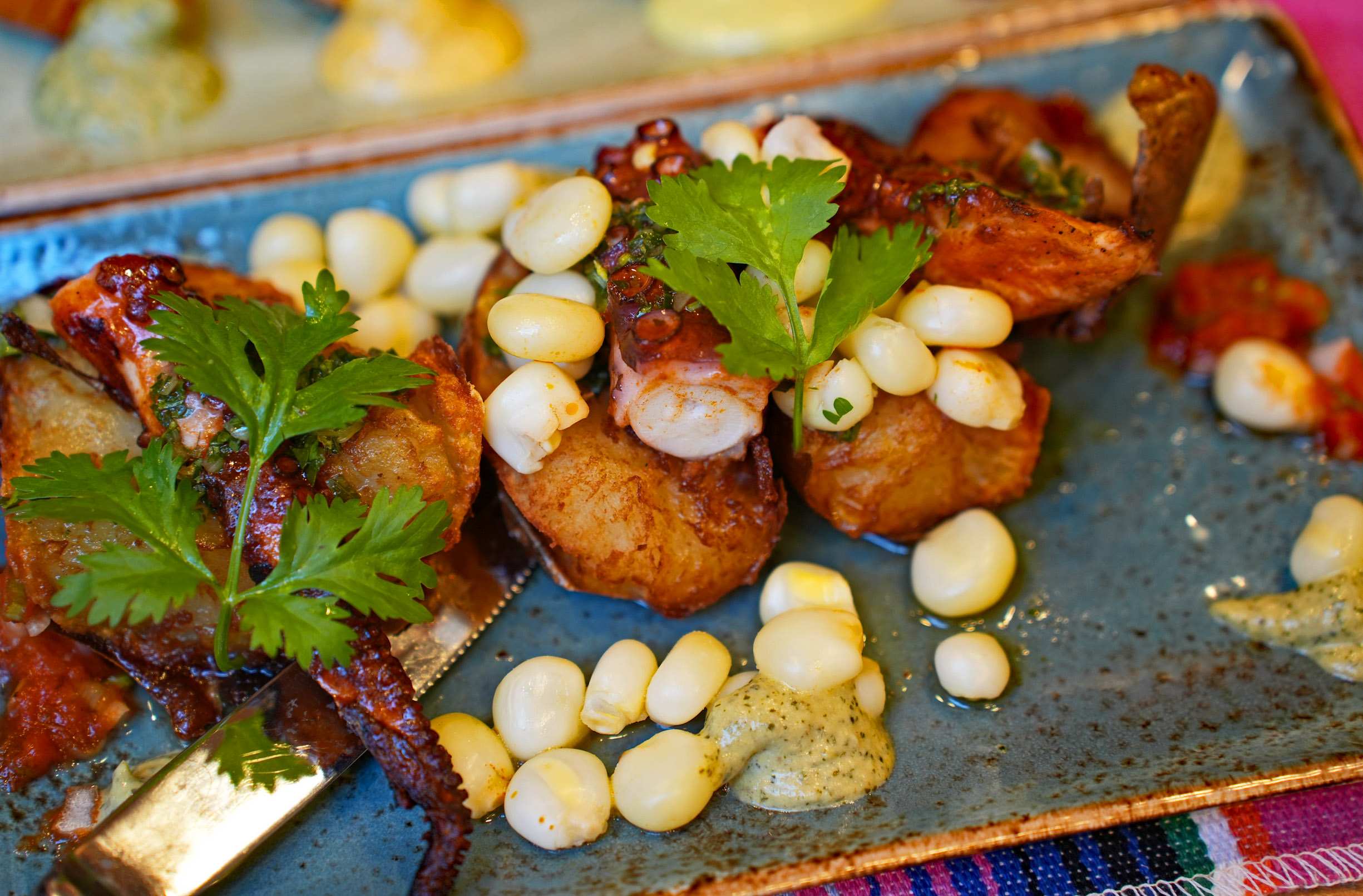 Anticucho de Pulpo from the charcoal grill might be the only octopus dish you ever need in your life. Outstandingly tender Spanish octopus is glazed with a special anticuchera barbecue sauce, and served with delightfully smashed Idaho potatoes, topped with chimichurri greens.