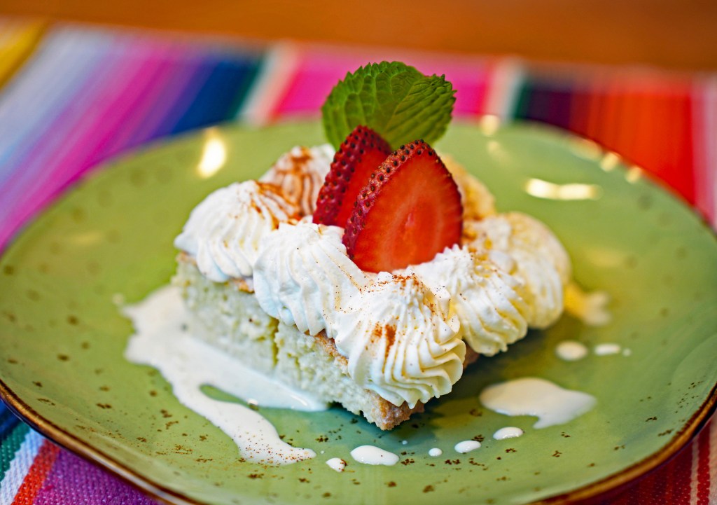No matter how full you are, try not to skip dessert. A sweet and airy Tres Leches is a very light sponge cake with all its air bubbles soaked in three kinds of milk—evaporated, condensed, and whole, and topped with clouds of whipped cream and fresh strawberries.