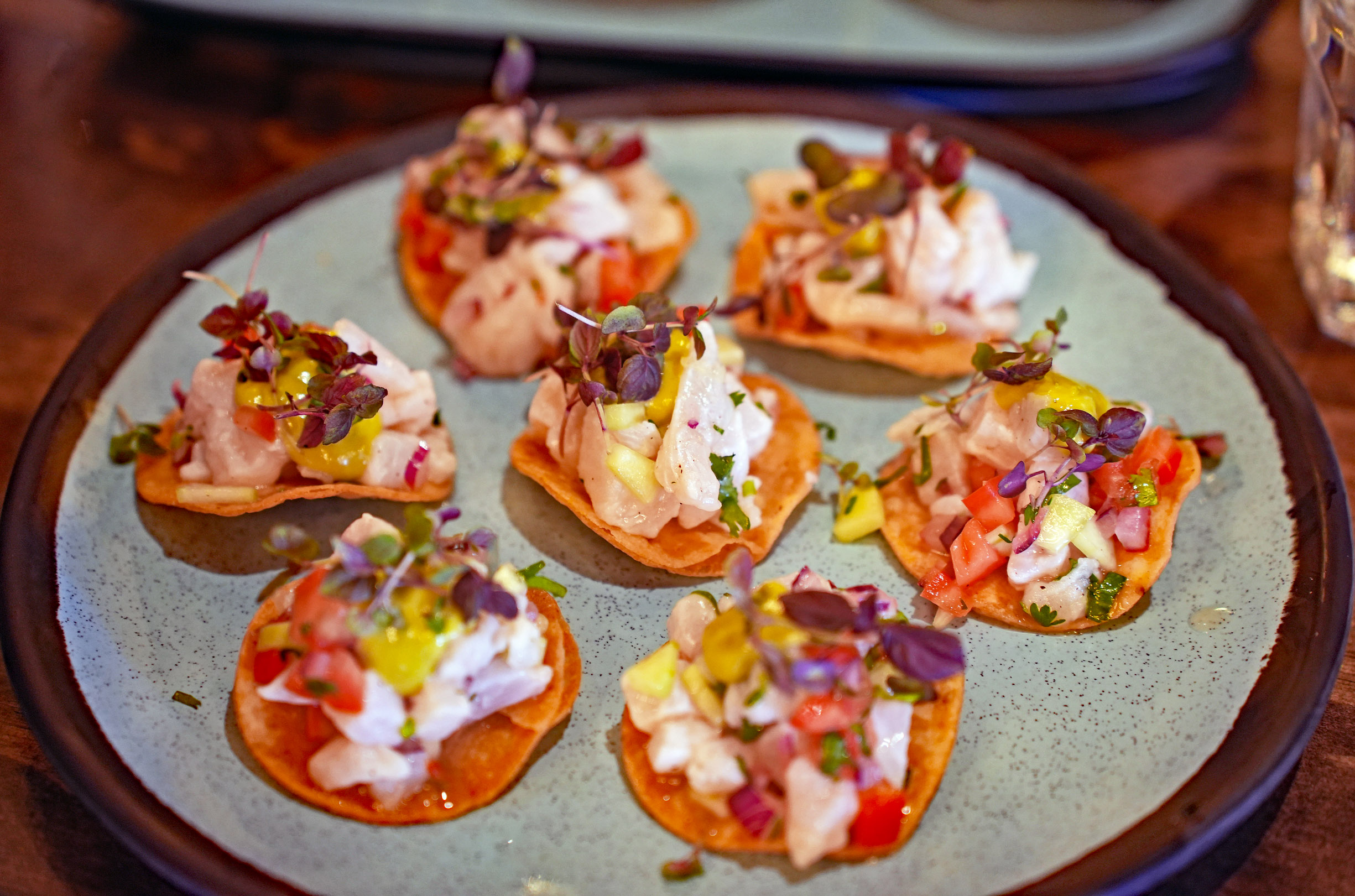 Another, rather sizeable appetizer platter, Cebiche Criollo, features catch of the day, fried calamari, Aji Amarillo Leche de Tigre sauce, choclo (Peruvian corn), and sweet potatoes.