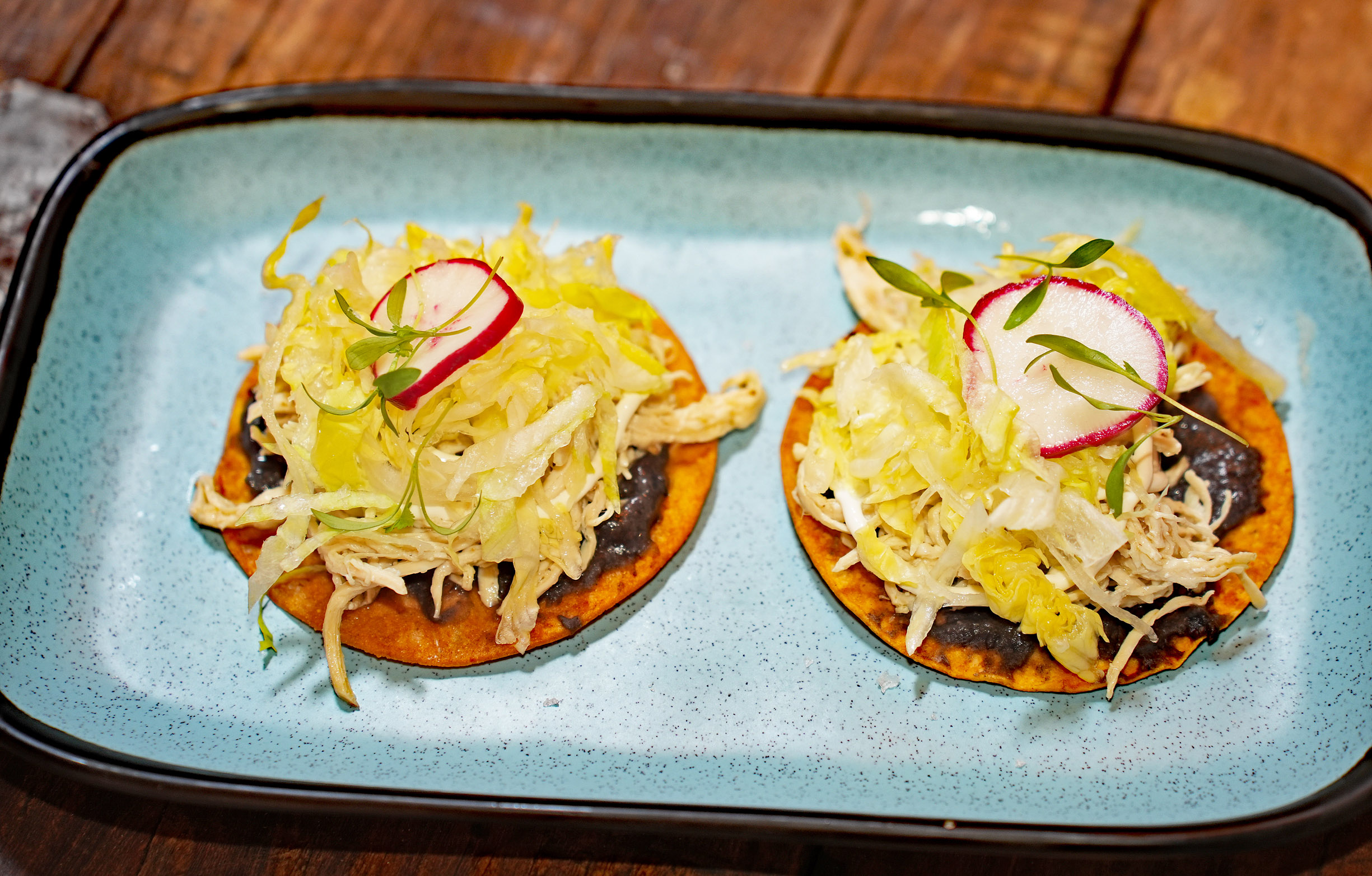 Other great starter choices are Ceviche Tostada (lime cooked flounder, serrano peppers, tomato, red onion, cilantro and avocado) and Tuna Tostada (sliced ahi tuna, avocado puree, sriracha aioli, cilantro).