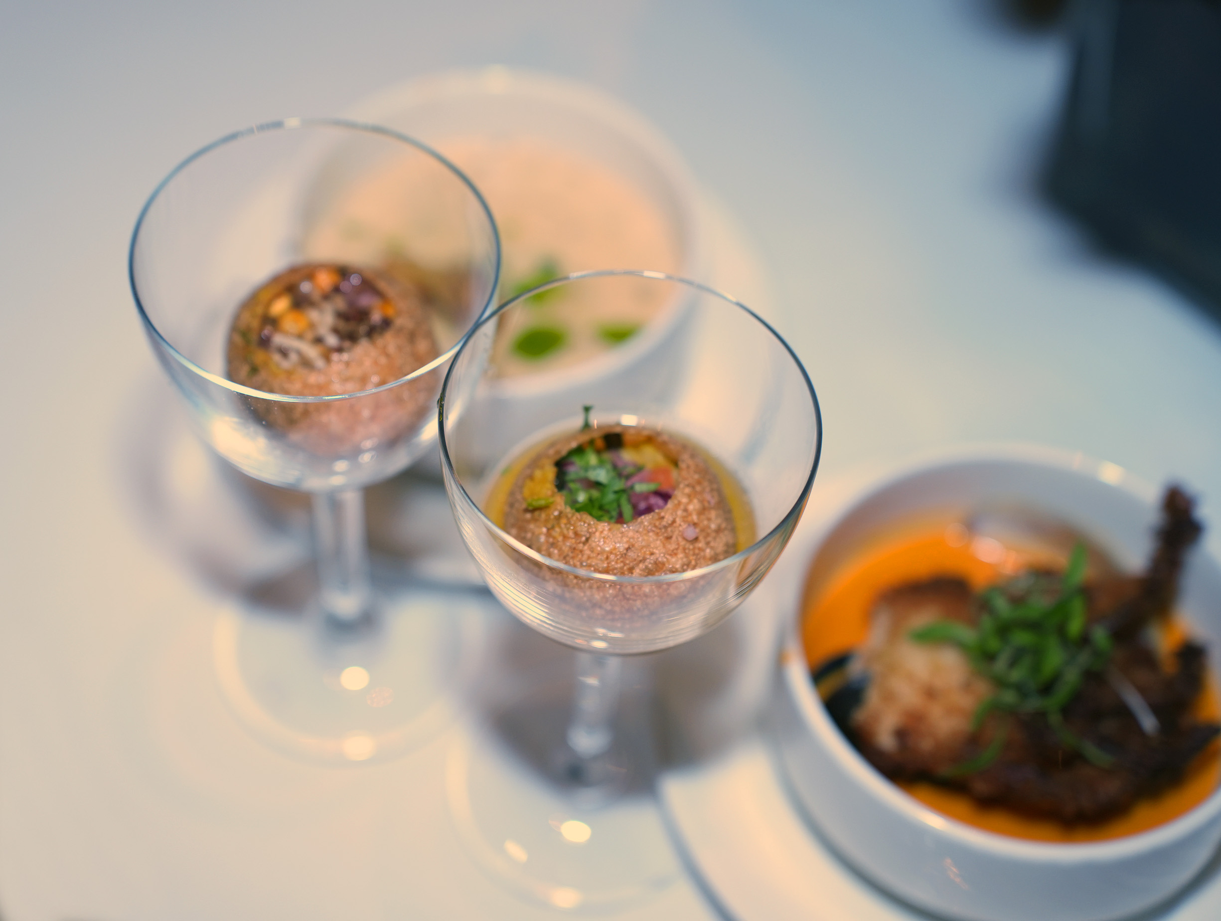 Chef Kim’s signature dinner was paired with two original cocktails—Frey Ranch Orchard (Frey Ranch Four Grain Straight Bourbon with pear, corn, wheat, lemon and smoked egg white), and Frey’s Fashion (Frey Ranch Straight Rye with sweet potato and candy cap mushrooms), and included intriguing grain-based dishes, like Smokey Wheat Berry Risotto with duck confit and preserves.