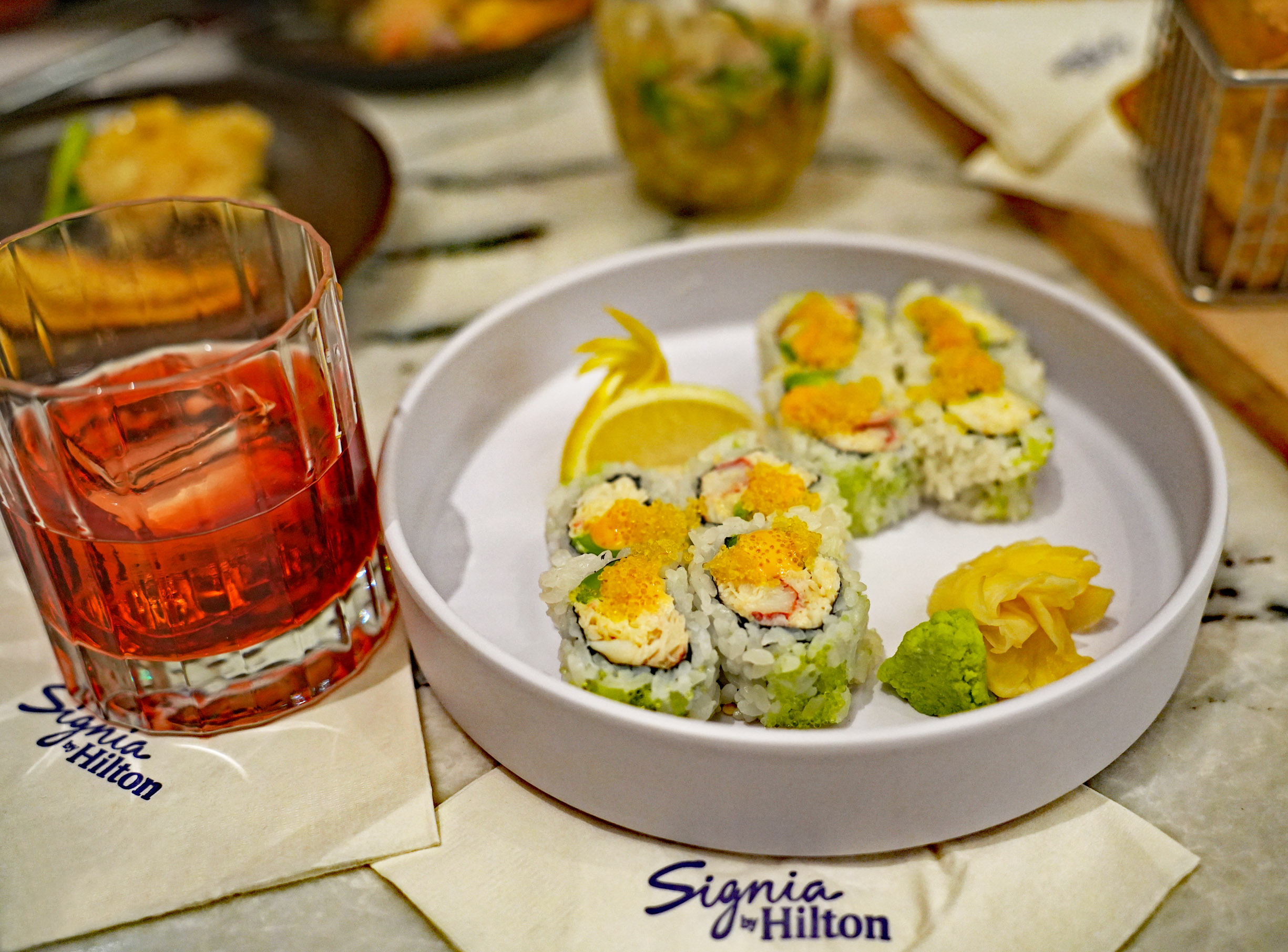 After lunching on Ceviche Huachinango (Spanish sea bass, leche de tigre, orange, sweet potato, coriander, red onion) and Dynamite California Roll (Dungeness crab, avocado, spicy mayo, wasabi caviar) with classic cocktails at the AJI Bar & Robata in the hotel lobby, I undertook a little tour of the many smartly appointed hotel facilities—restaurants, meeting facilities, conference rooms, and hallways, adorned with modern art and made to exude casual friendliness and understated luxury.