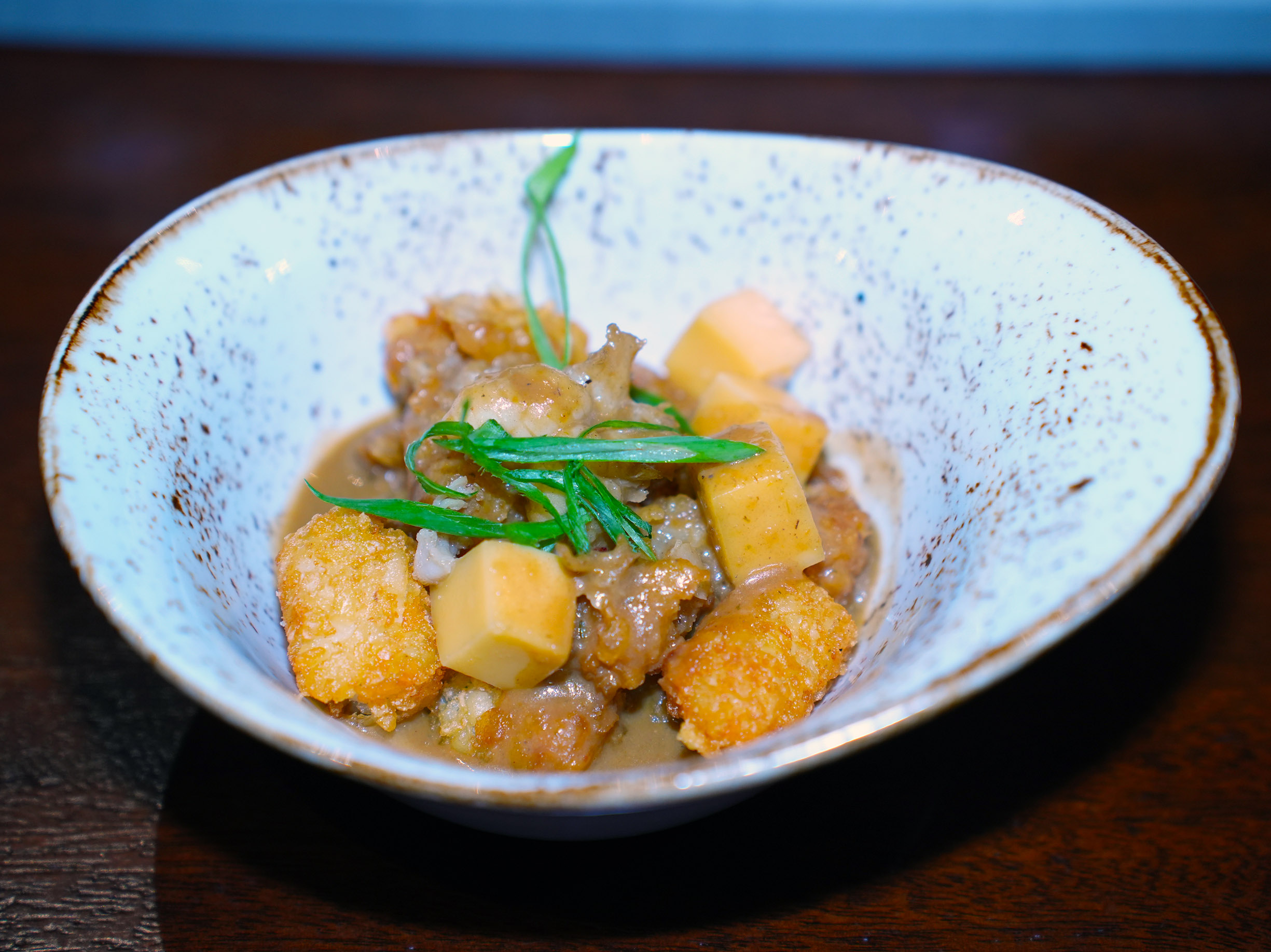 Craft cocktails, served alongside the tasting shots, started with a welcome drink, Lynchburg 75 (Jack Bonded, apricot liqueur, lemon juice, sparkling wine) and proceeded to a Tennessee Prospector (Jack Triple Mash, Montenegro Amaro, Combier Pamplemousse liqueur, grapefruit bitters) paired with the first course—Persimmon and Arugula Salad with pomegranate seeds, toasted pepitas, citrus vinaigrette, and Point Reyes blue cheese croutons. The Canuck cocktail (Jack Bonded Rye, lemon juice, Chambord, Cointreau) accompanied the second course, Lobster Poutine with tater tots, lobster bisque, smoked Gouda, fresh chive, and lobster claw meat.