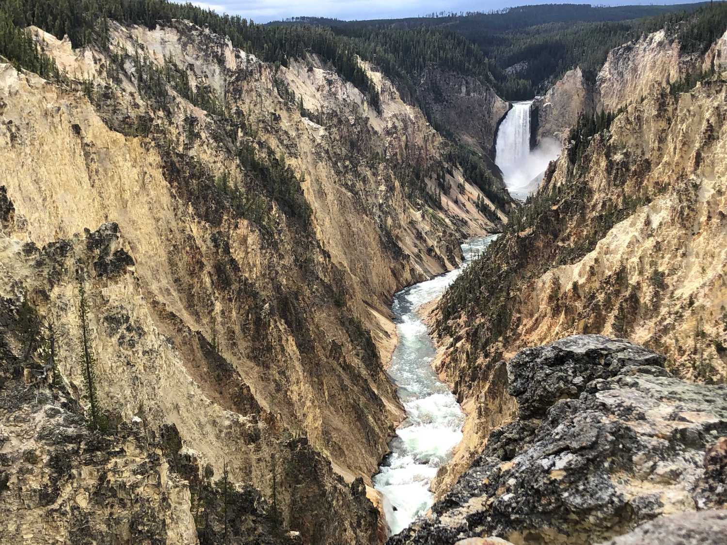 We then drove about one hour to the Grand Canyon of the Yellowstone. This impressive 20-mile-long canyon is about 1000 feet deep. The canyon was carved by the Yellowstone River. The best and most popular viewing point is at Artist’s Point, where the Lower Falls crash into the Yellowstone River below. From the large parking lot, it is a short walk to Artist’s Point. We drove to several other overlooks along the south rim to see slightly different views of the canyon and the falls. The Upper Falls viewpoint had very scenic views of the canyon and the river below. Nearby in Canyon Village, there is a visitor education center where rangers again provided valuable park information. We particularly enjoyed a 20-minute ranger talk right by Artist’s Point.