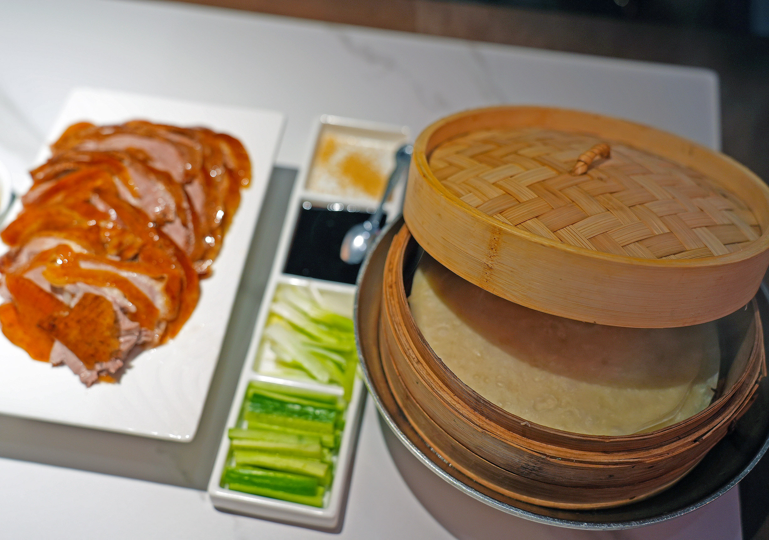 At serving time, the duck is sliced and brought to the table along with julienned cucumbers, scallions, house-made Hoisin sauce, and flour wraps, kept warm in a bamboo steamer.