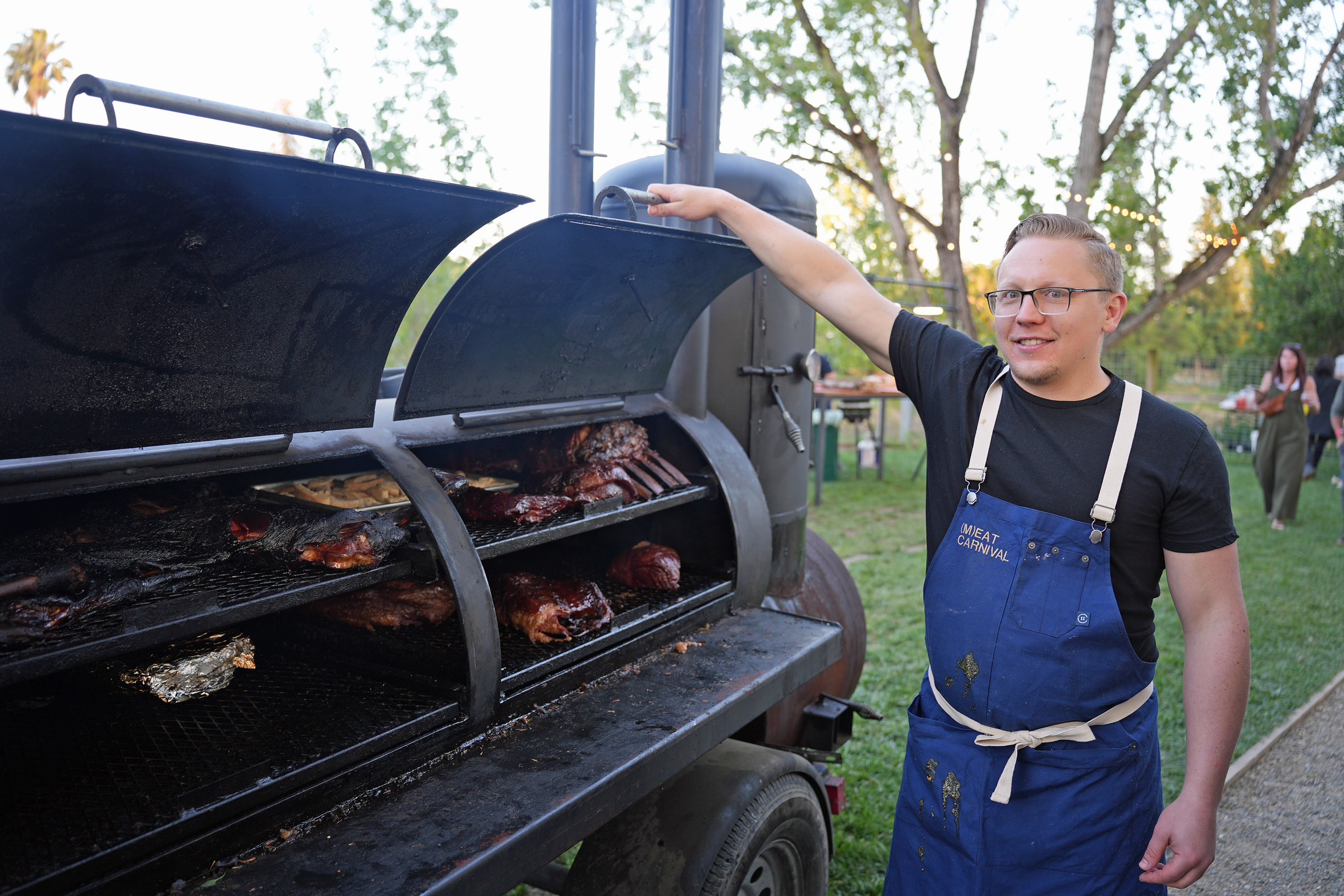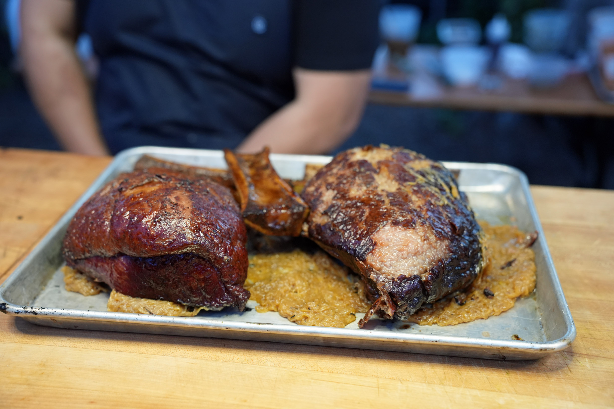 For the 2024 series of meat grilling, baking, frying, and smoking events, La Brea Bakery, a premier producer of artisan breads, supplied a variety of baked goods to pair with beef ribs, lamb shanks, halibut crudo, hummus and tzatziki dips, hot shakshuka, and sabich sandwiches of pita stuffed with fried eggplants, hard boiled eggs, chopped salad, parsley, and amba and tahini sauces.
