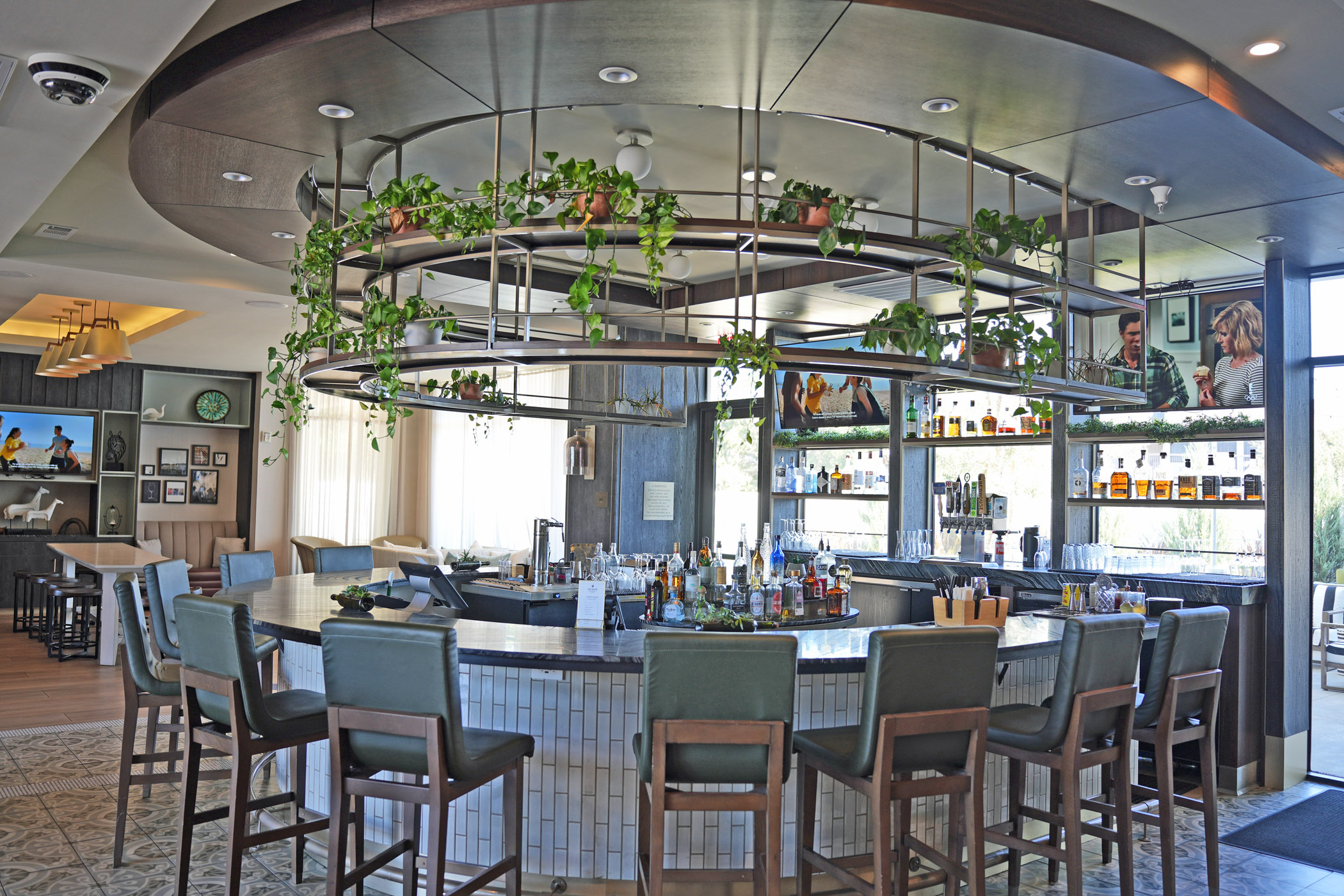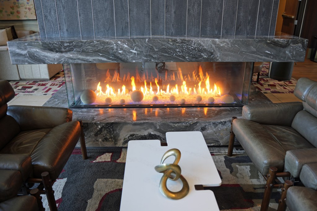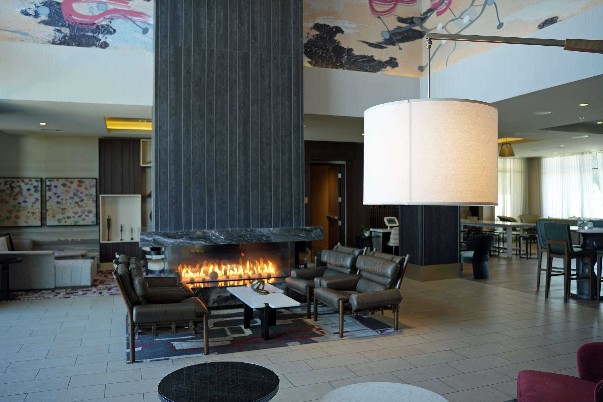 The new 90-room boutique hotel greets its guests with a spacious lobby, decorated with contemporary art murals and paintings, and a glass-encased fireplace that looks positively welcoming and inspiring. A horseshoe-shaped lobby bar with potted ivies overhead and two large TV screens above a display of shiny bottles has direct access to a pretty backyard, furnished with armchairs and tables, and equipped with patio games, a fire pit, and a fenced hot tub.