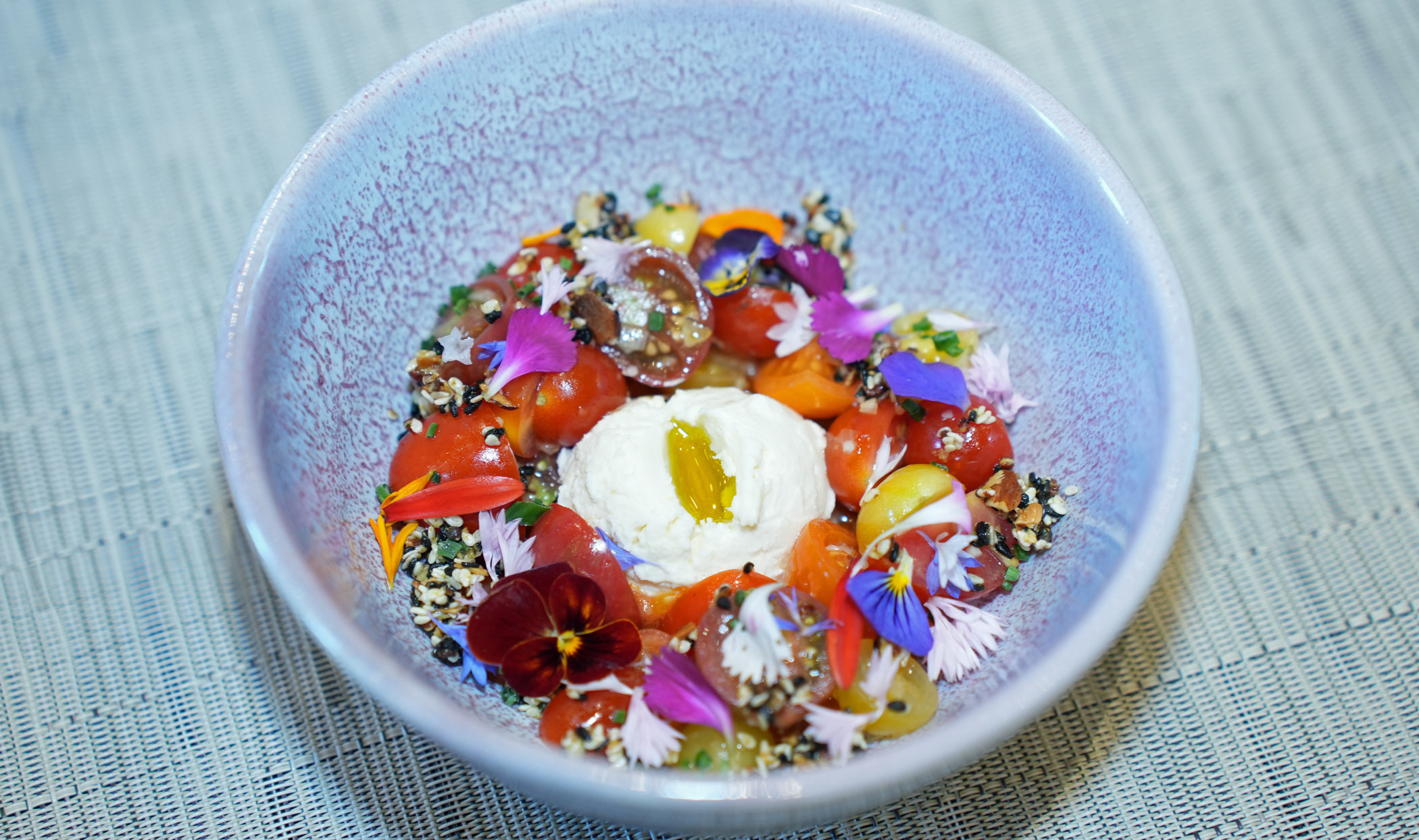 2016 Lamoreaux Vineyard Cabernet Sauvignon (one of the best vintages, aged in barrels for 20 months, released in 2018) brought about a dish of Local Tomato Salad, a true masterpiece of fresh Toybox cherry tomatoes, marinated in ginger, garlic, scallion, and local olive oil, and combined with smoked tomato jam, quinoa granola, and edible flowers, placed like a mini wreath around some white miso ricotta.
