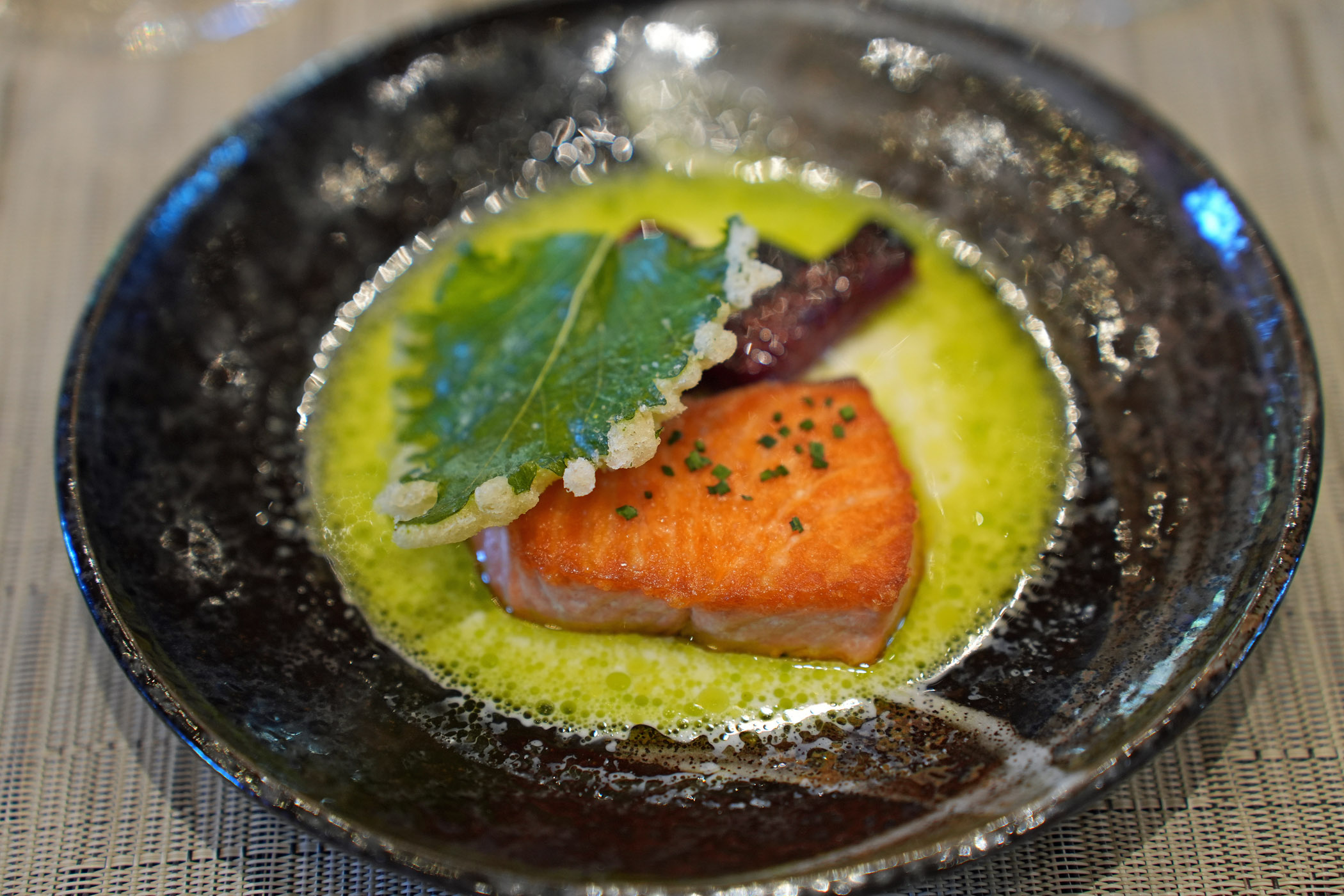 2017 Tonella Vineyard Cabernet Sauvignon (a classic Rutherford, bigger on the palate, fruit forward, with dry tannins), made way for Pan-Seared King Salmon (the “wagyu of salmon”) with Greek yogurt ponzu sauce, Napa Valley-grown purple daikon and tempura shiso leaf.