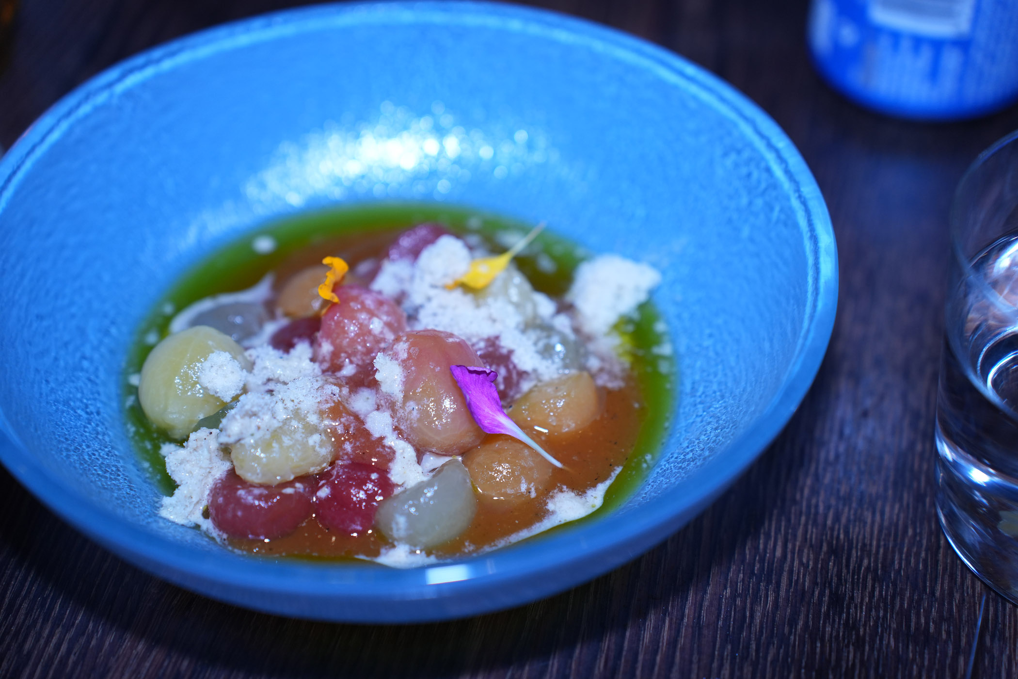 A lush, seasonal fruit salad Frutas a la Ines contains carved cantaloupe and honeydew melons compressed in aguardiente, pickled toybox tomatoes, papaya-lime vinaigrette, lulo-guava gel, avena granita, and basil oil.