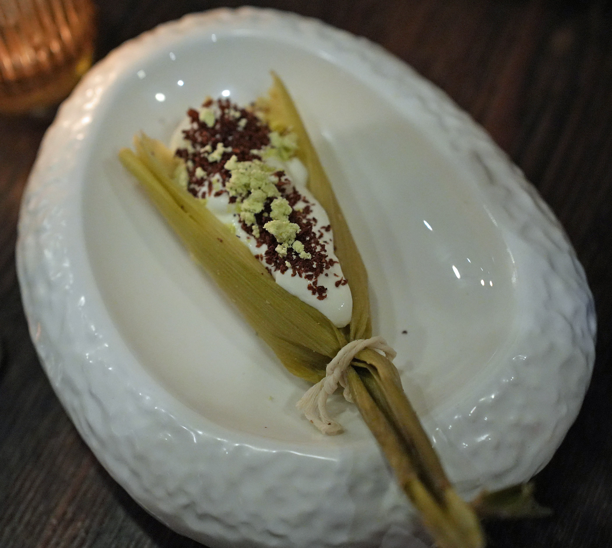 A handmade corn cake, called Envuelto de Mazorca is wrapped in corn husk, and sprinkled with crema, “crumbs” of migas de hongo, and basil dust.