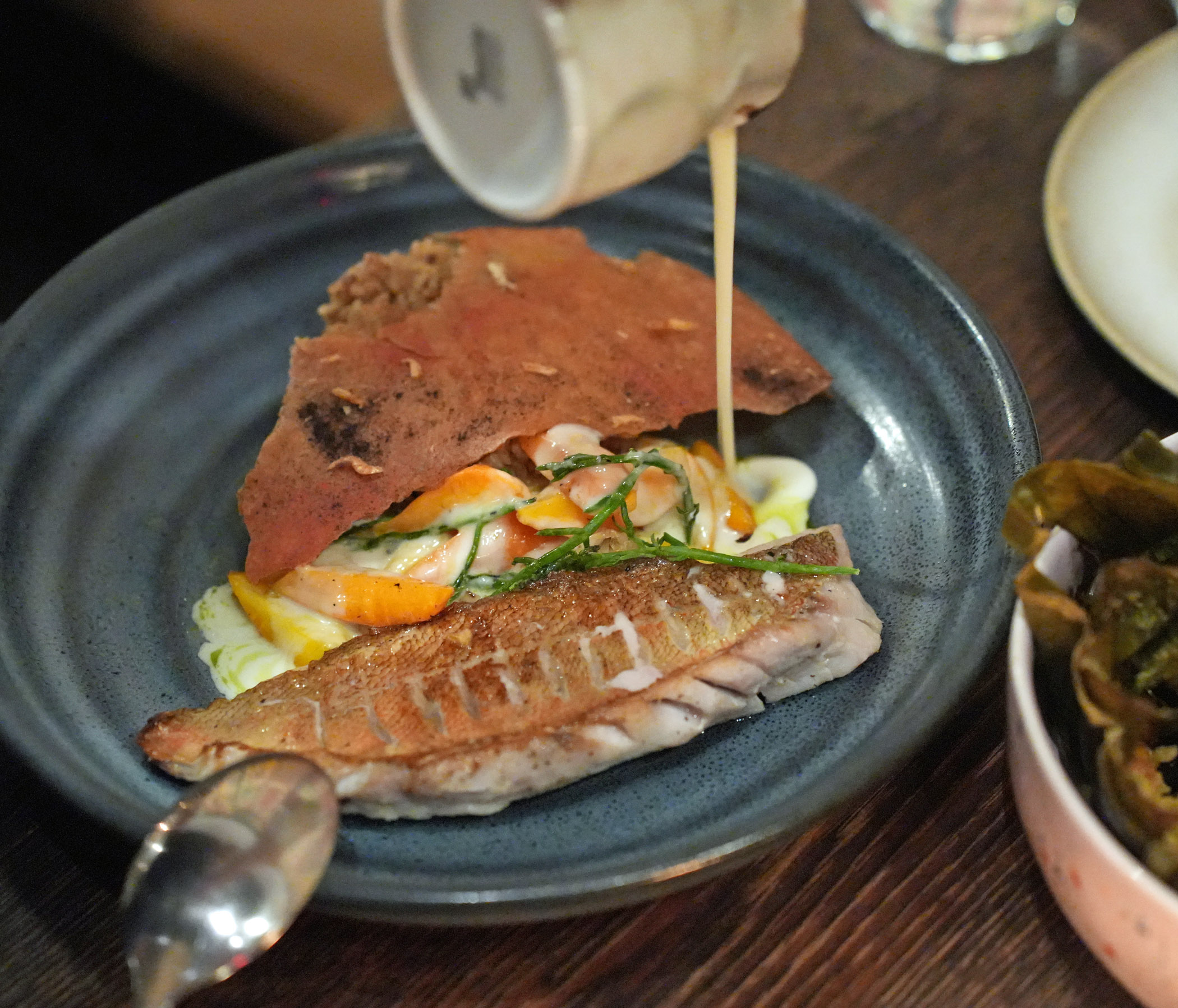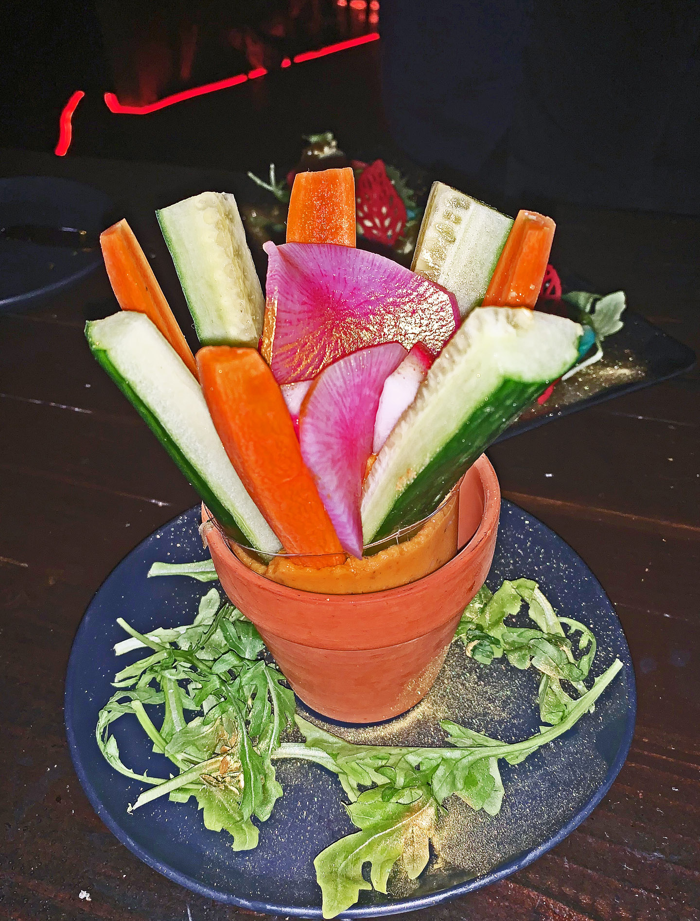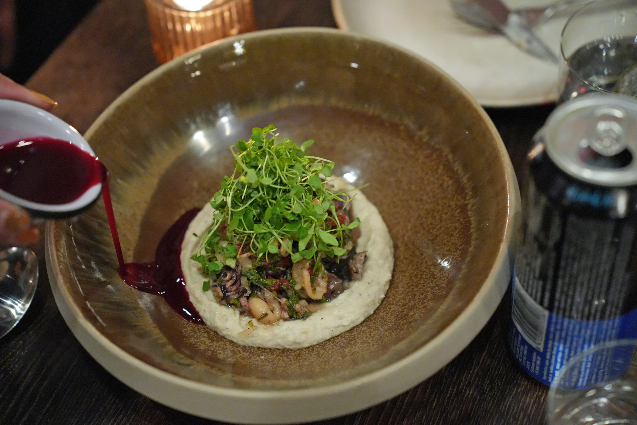 Among the starters, El Cartagenero stands out as a complex protein rich salad made of furikake crusted yellowfin tuna, smoked calamari, celery root, and hearts of palm purée, dressed with roasted Fresno peppers aioli and an amazing, poured tableside, red beet leche de tigre.