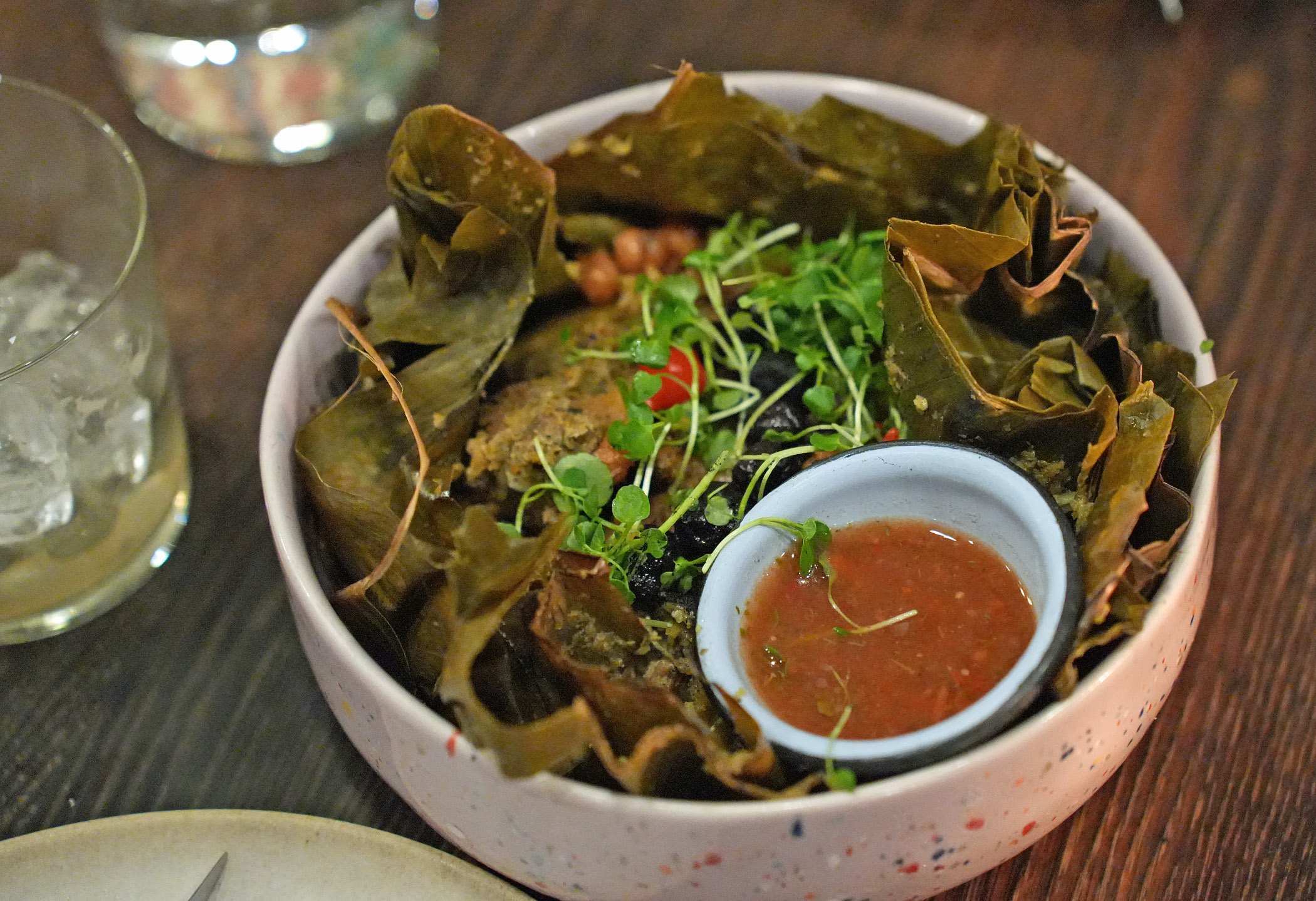 Tamal Tolimense is served in banana leaves that reveal corn-rice masa, morsels of rabbit and chicharron, pickled spicy berries, crispy chickpeas, aji, and carrot puree.