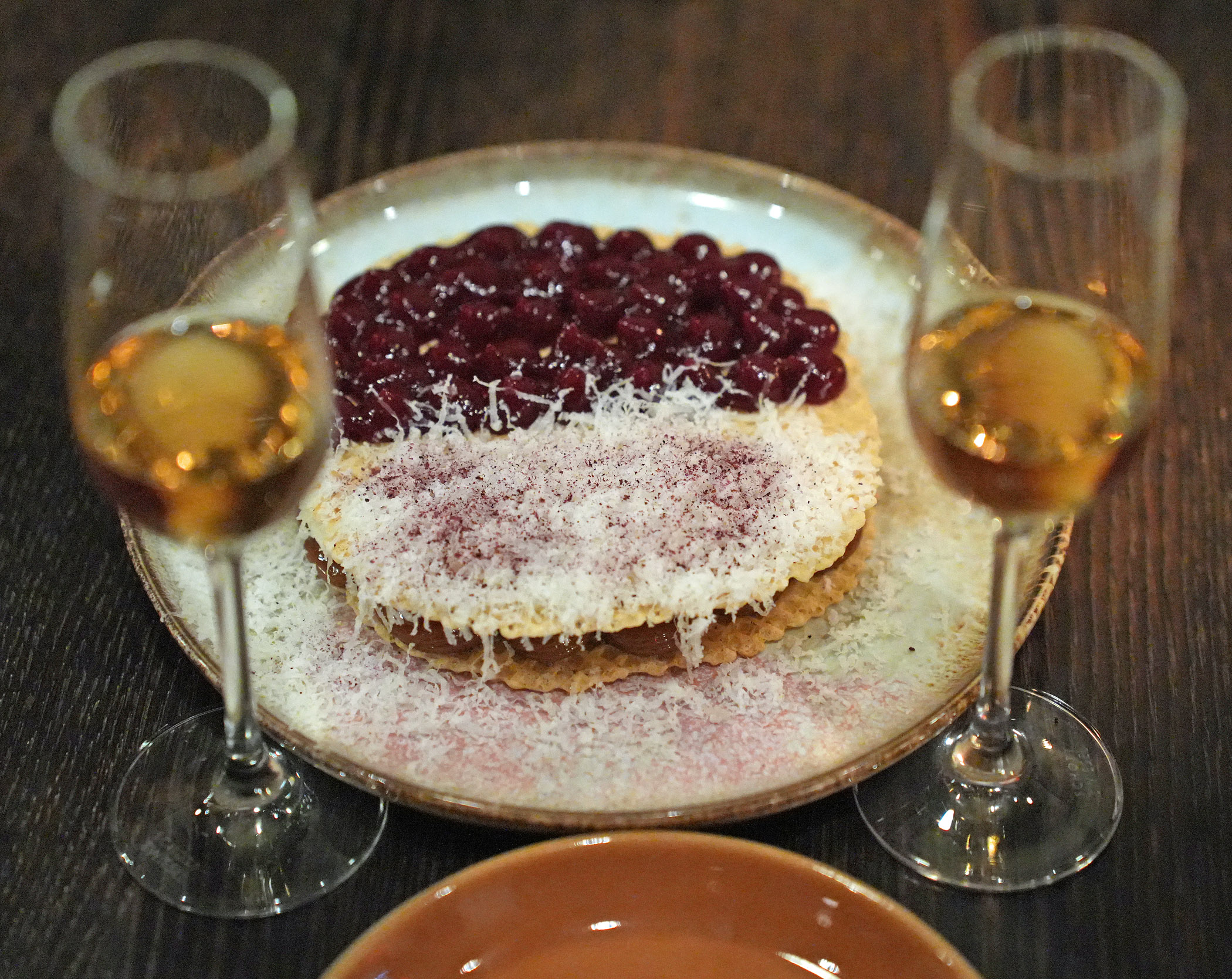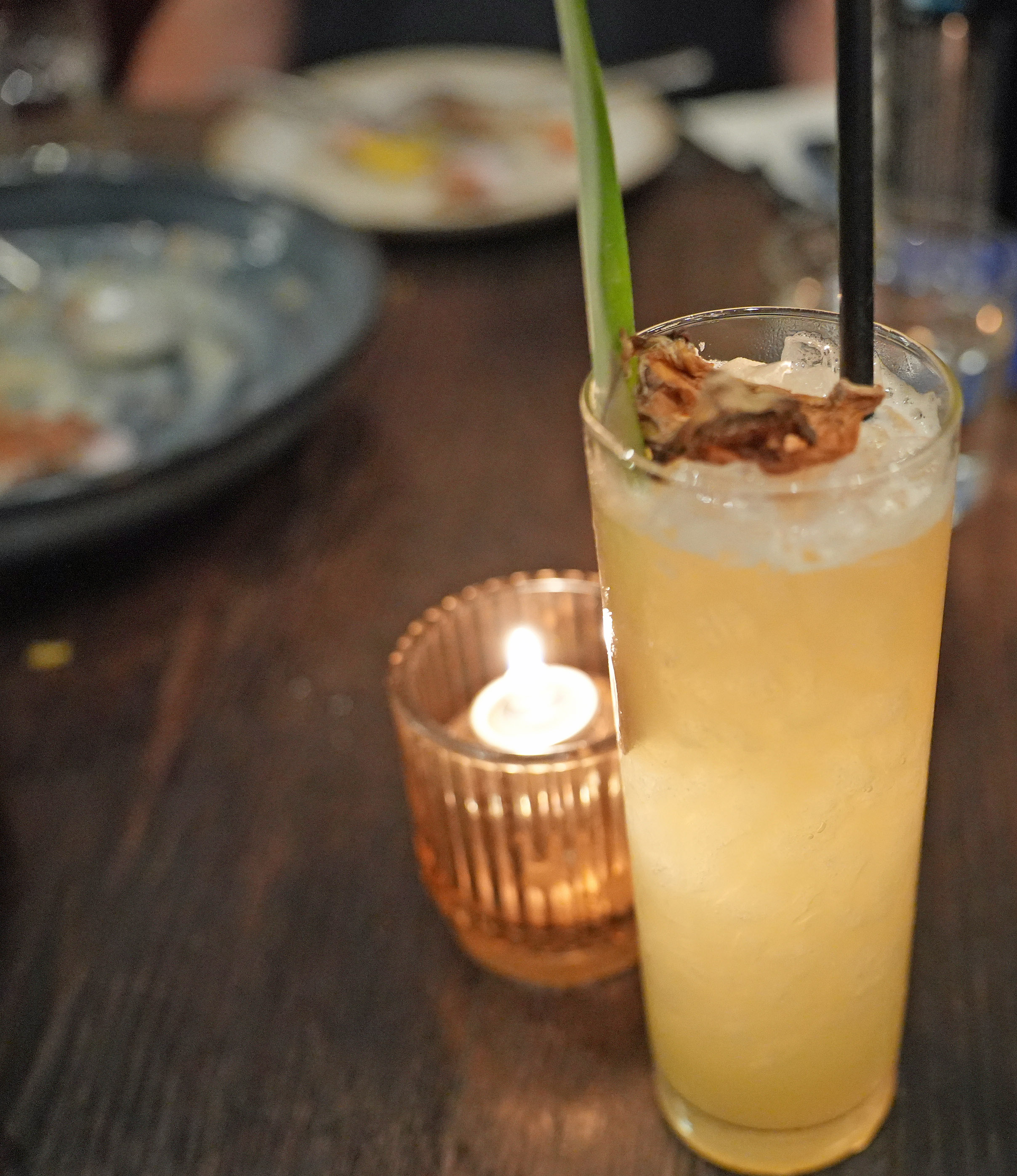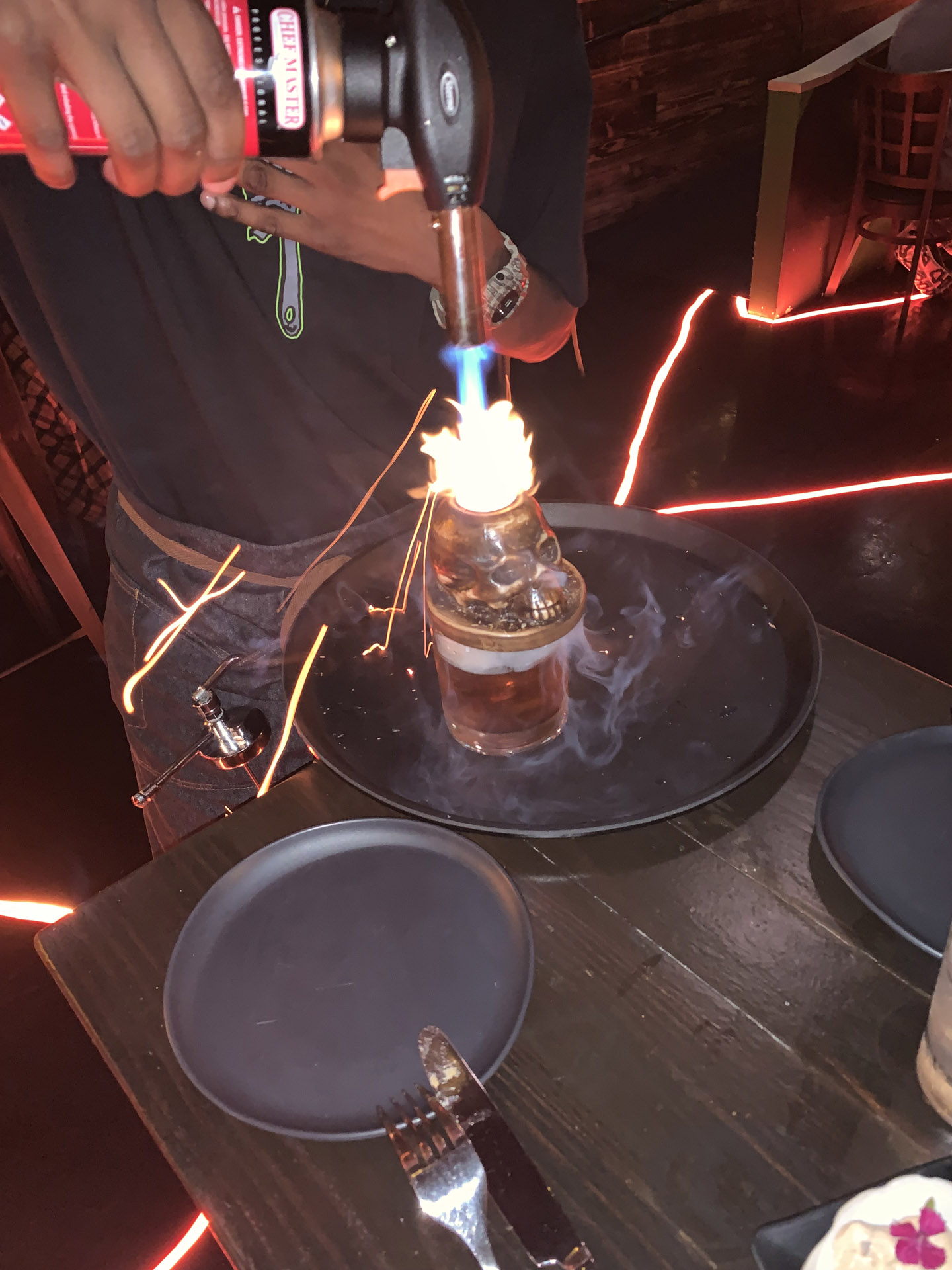 Creative cocktails, like Unicorn Blood (pea flower infused vodka, La Marca prosecco, bergamot, citrus, honey, shimmer), Polly Potion (bourbon, house green apple and Asian pear puree, yuzu, mint, egg white), and especially Smoke & Mirrors (rye, Maraska Green Walnut, turbinado sugar, tobacco, black walnut bitters, smoke) produce quite a visual effect with live fire, smoke, and mini fireworks when they arrive at the table.