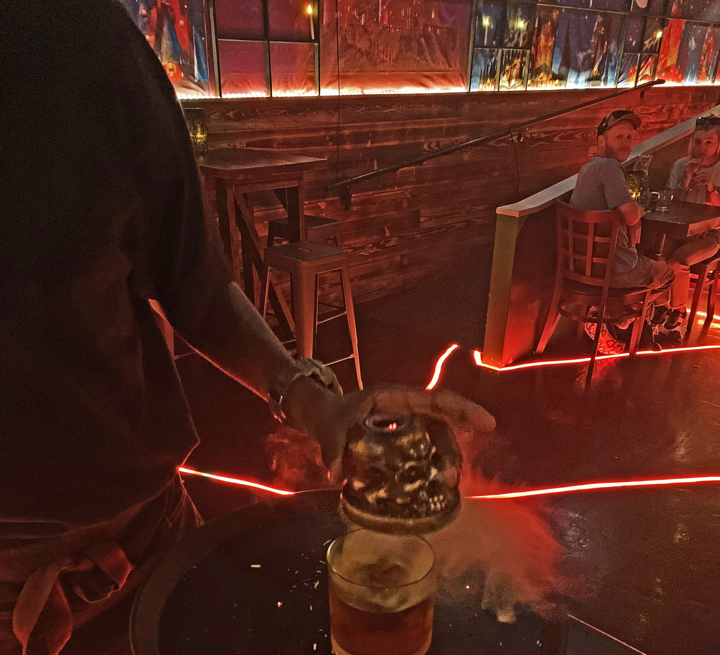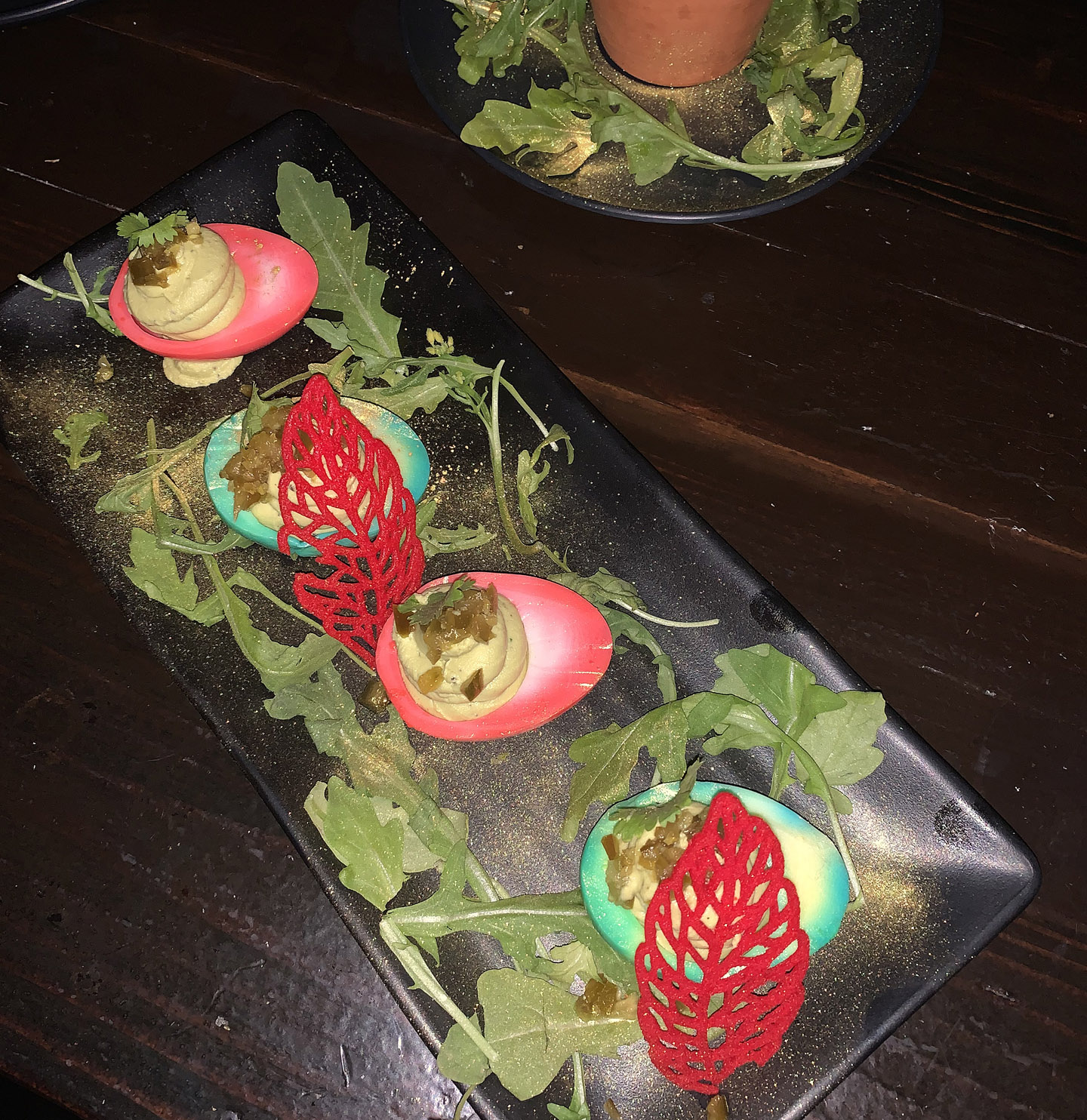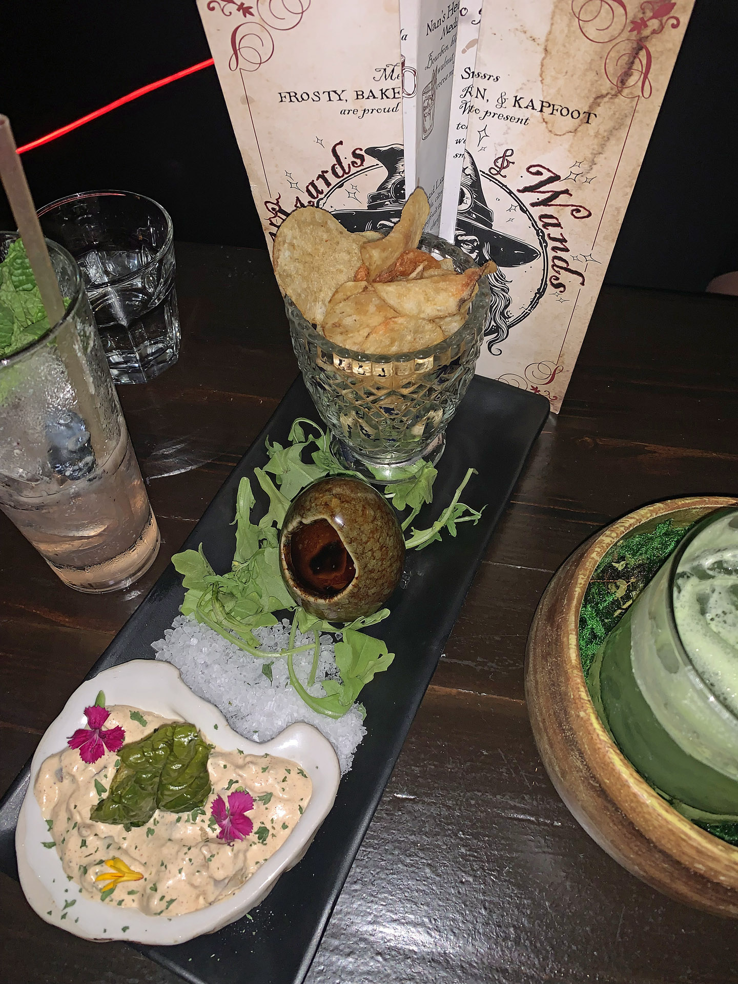 The sorcerous libations are supplemented by curious things from the Cauldron Cookery menu: Dragon’s Breath (flaming hot Cheetos with liquid nitrogen), Deviled Dragon Eggs (guacamole, pickled jalapeno, cilantro), Darko’s Oyster Dip (housemade smoked oyster dip served with Kettle chips) and others, decorated with candy wings or chocolate frogs, and whimsically plated. https://www.opentable.com/r/wizards-and-wands-san-francisco.