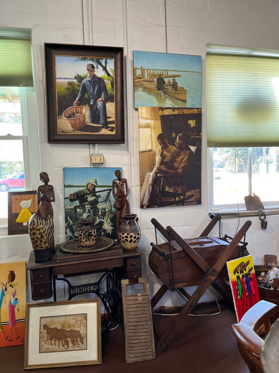 On St. Helen Island, just 8 minutes across the bridge from Beaufort at 870 Sea Island Parkway, is another historical treasure you will not want to miss: It is open 10 – 5 Mondays through Saturdays: The Gullah-Geechee Cultural Visitors’ Center and Ly Bensons Gallery and Studio. This is a historical Gallery featuring the local African American history. This small museum has many amazing pieces in the rare collections of folk-art paintings and gifts and rare (extremely valuable) Zimbabwe Shona Verdite sculptures. This is the largest collection of this rare green rock sculpture in the world. There are also imported African baskets on display. All around these islands we saw local women beside the roadways weaving Sea Island baskets, copying the amazing talents and patterns of the older imported ones. These locally made baskets are quite valuable treasures to purchase as souvenirs.