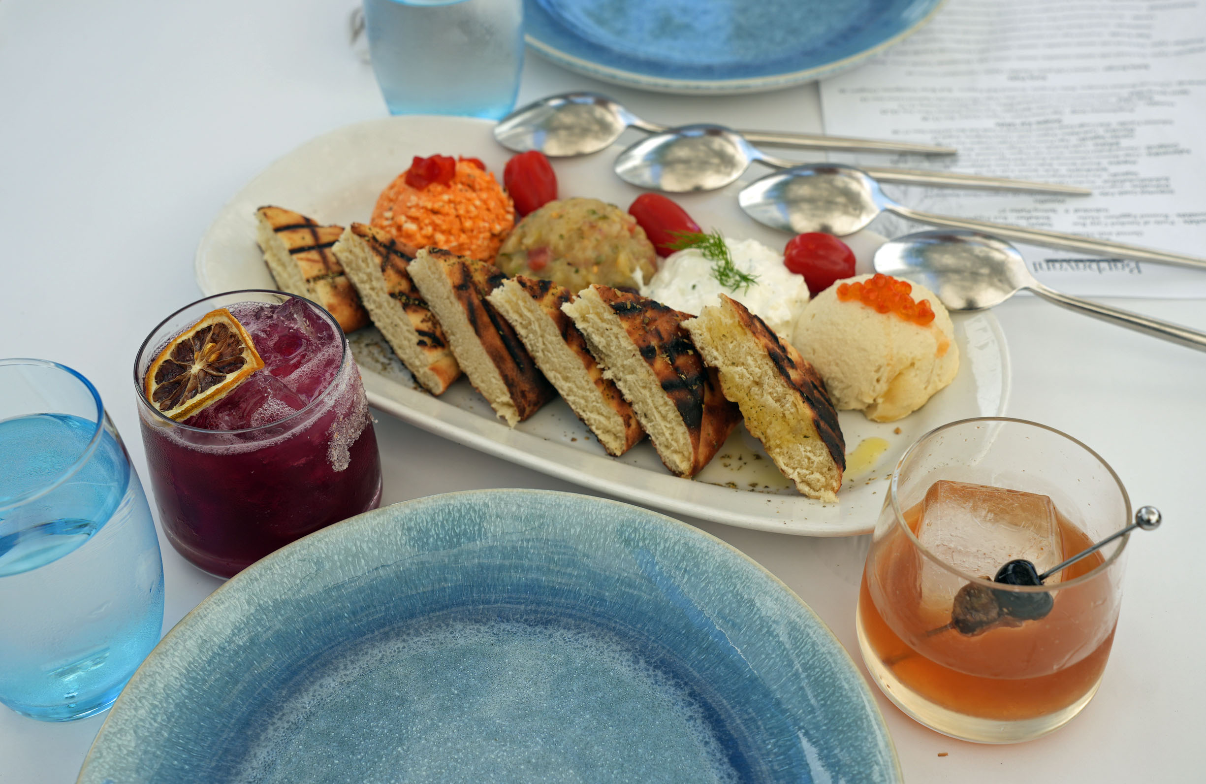 Always start with Barbayani Pikilia—an assortment of traditional appetizer dips served with a house-made pita bread. It includes Taramosalata—puree of smoked carp roe, Tzatziki—cucumber and dill yogurt sauce, Melitzanosalata—roasted eggplant with herbs, and Triokafteri—red pepper with feta cheese and garlic.