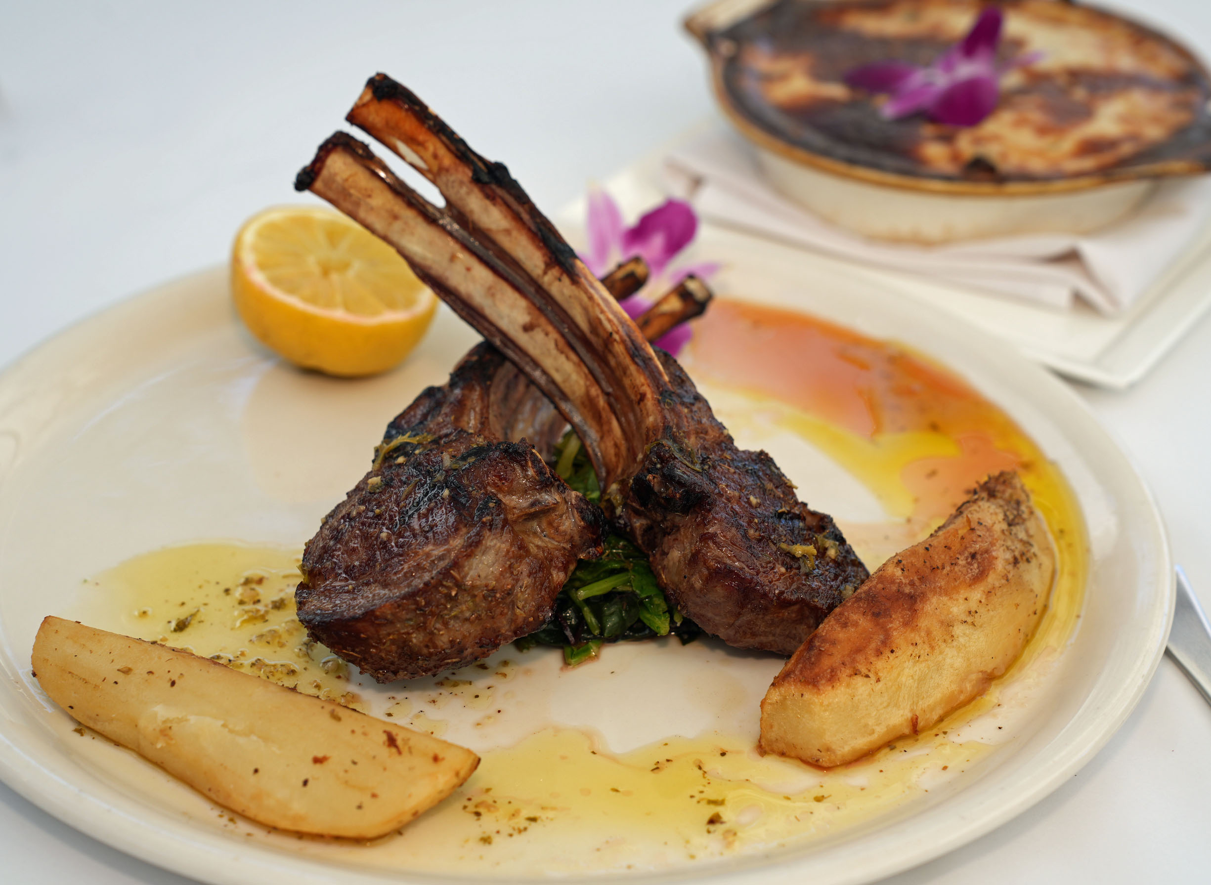 Choosing from a long menu of tempting specialties isn’t easy, but you can’t go wrong with Paidakia—mesquite grilled rib cut lamb chops over braised greens with Barba potatoes in lemon vinaigrette on a side as well as Moussaka—ground beef and lamb with grilled eggplant and roasted potato in béchamel sauce.