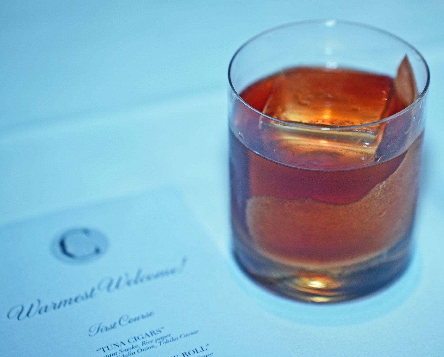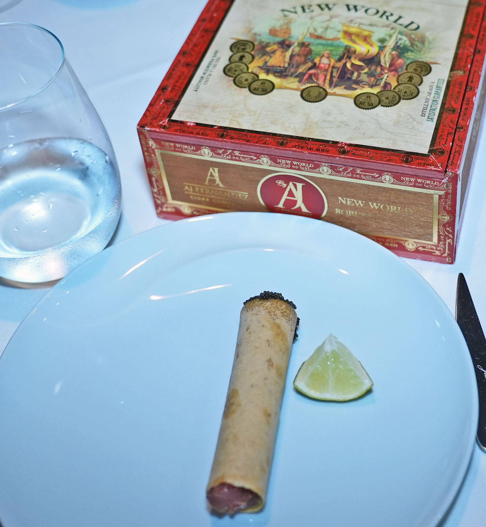 The menu is full of surprises, starting with Tuna Cigars brought to the table in a real cigar box, filled with instant smoke from which emerges a delicate fried dough tube containing tuna, avocado, and other ingredients, complete with caviar “ash.”