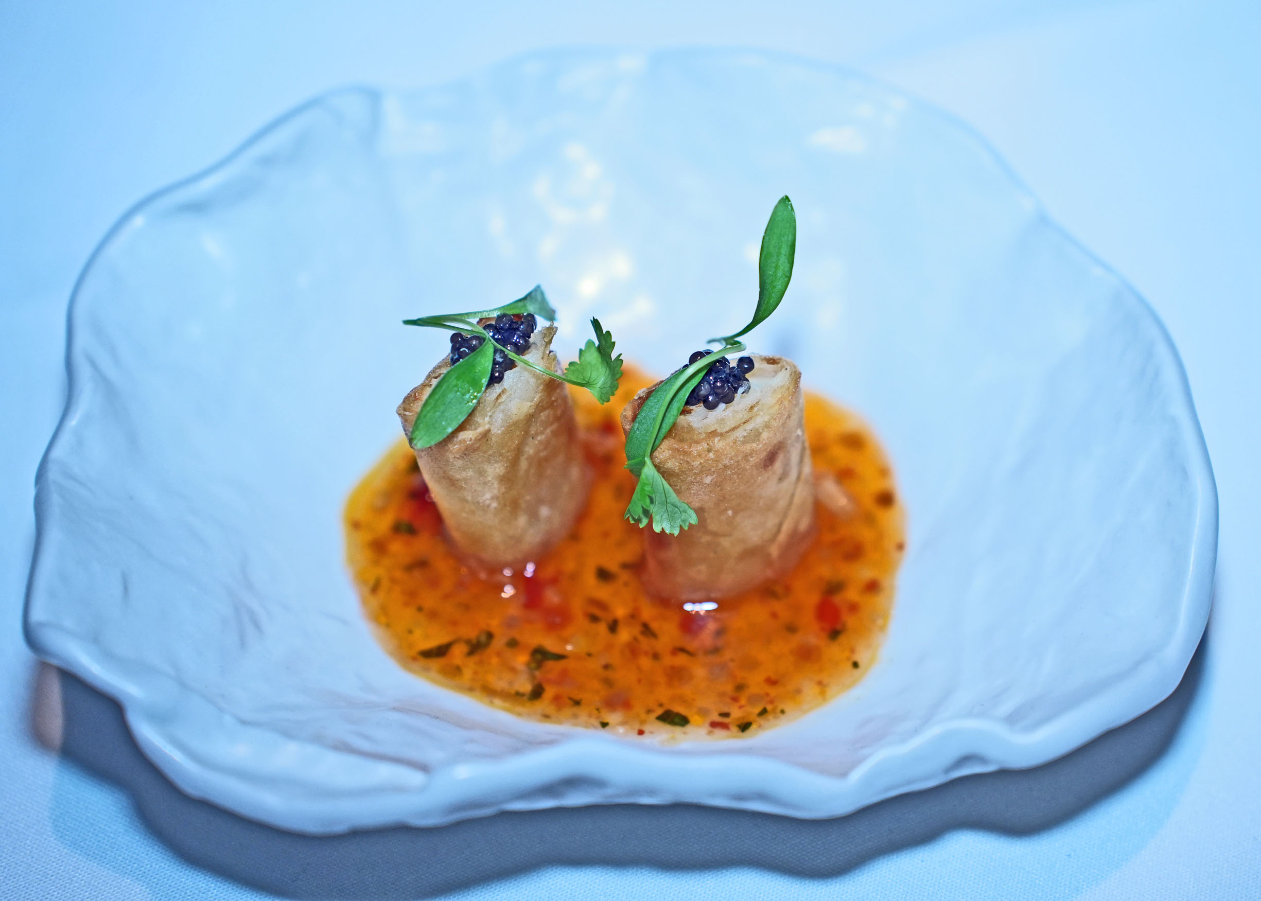 Caviar & Crispy Langoustine Roll with Royal Kaluga and sweet chili sauce can be called, a perfect bite, because the harmony of flavors and textures in this sophisticated appetizer is nothing short of perfection.
