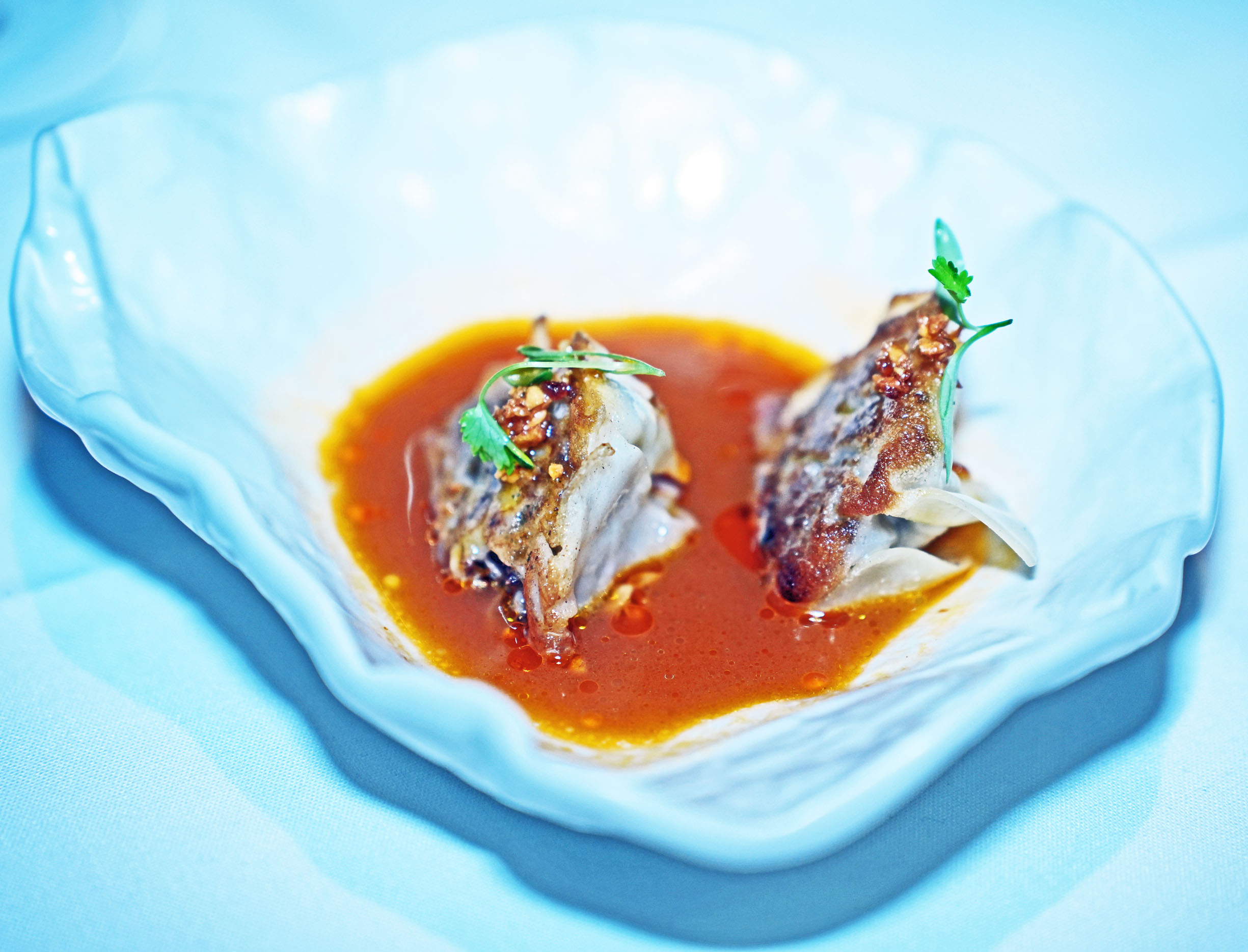 Bo Kho Wagyu & Dumplings, pan seared to golden-brown, are filled with the tenderest combination of Snake River Farms beef and bone marrow, and bathed in lemongrass-tomato jus.