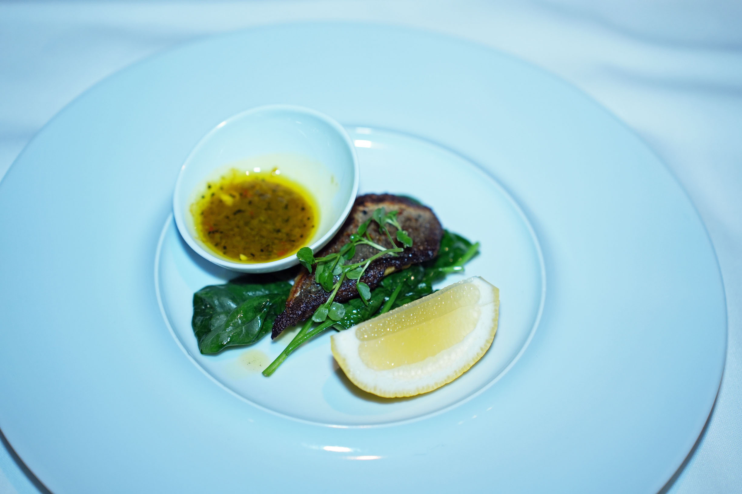 Crispy Branzino on a bed of spinach with turmeric-lemongrass-garlic-lime sauce is yet another wonderful creation of a distinguished chef.