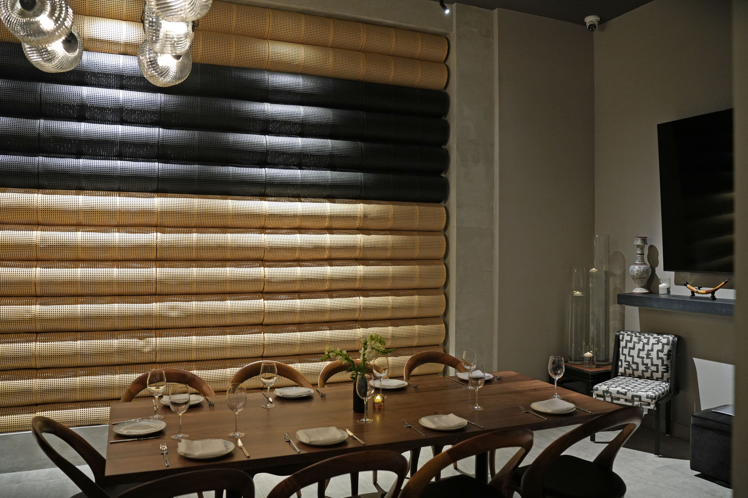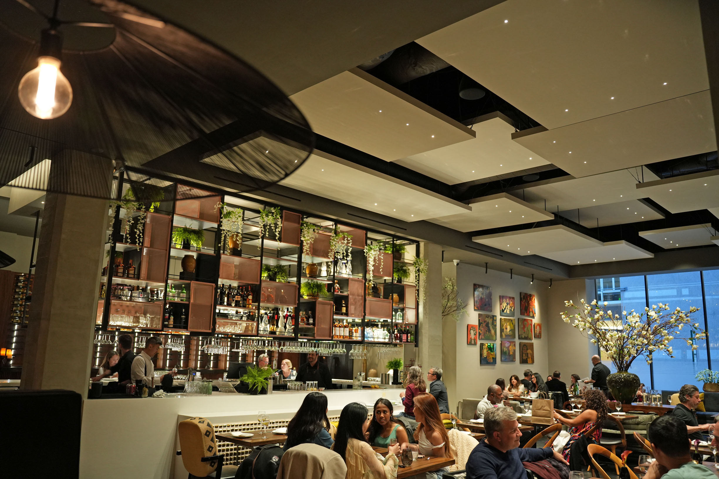 At the just opened posh new location on Pine Street in the Financial District, the ambiance is chic, contemporary, and visually elevated with striking design elements of time-honored traditional art and royal luxury—from unique 18th century carved wooden door entrance to thoughtfully spaced-out tables, decadently comfy chairs, and sound absorbing panels under the cathedral-style ceiling.