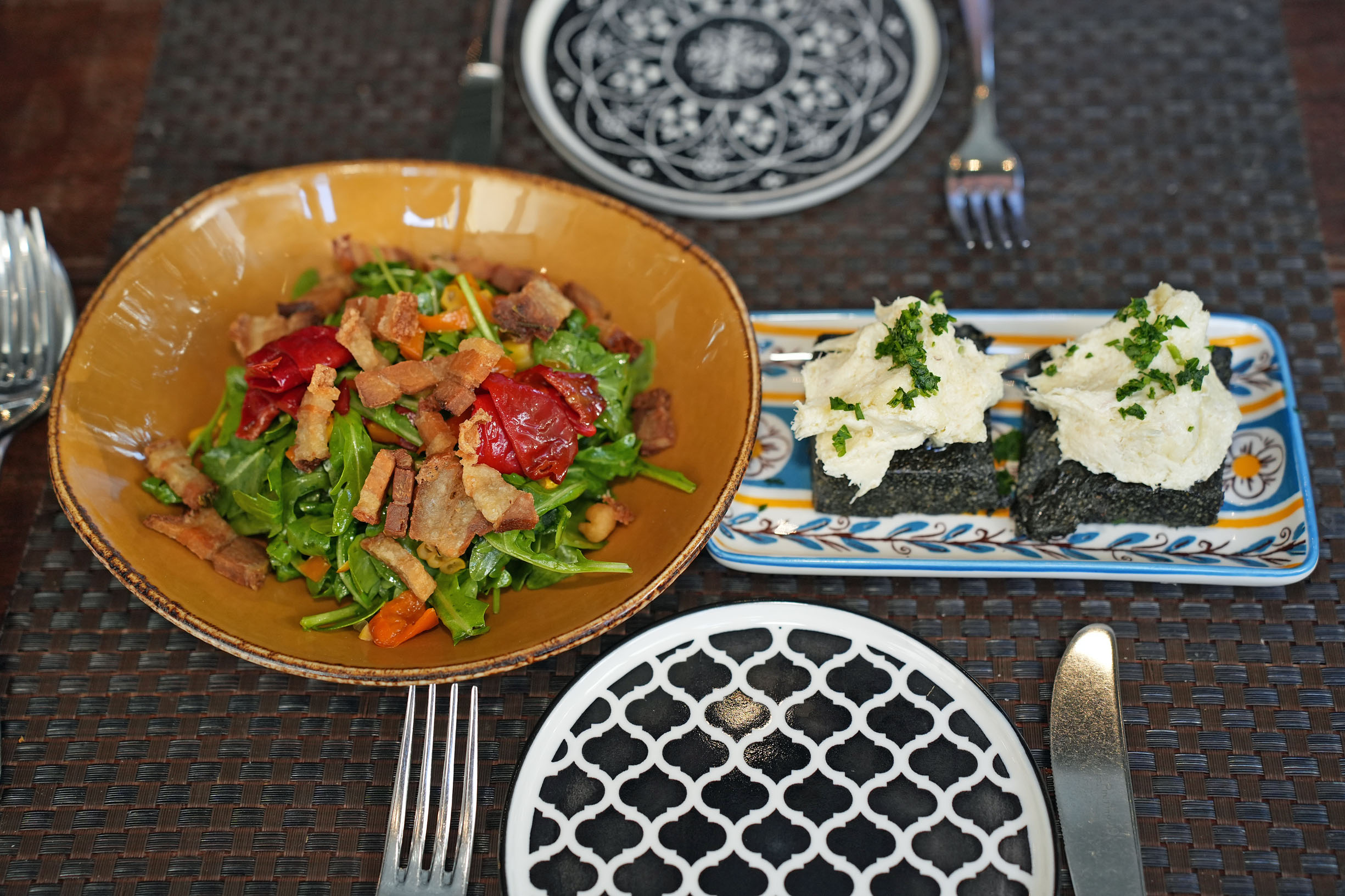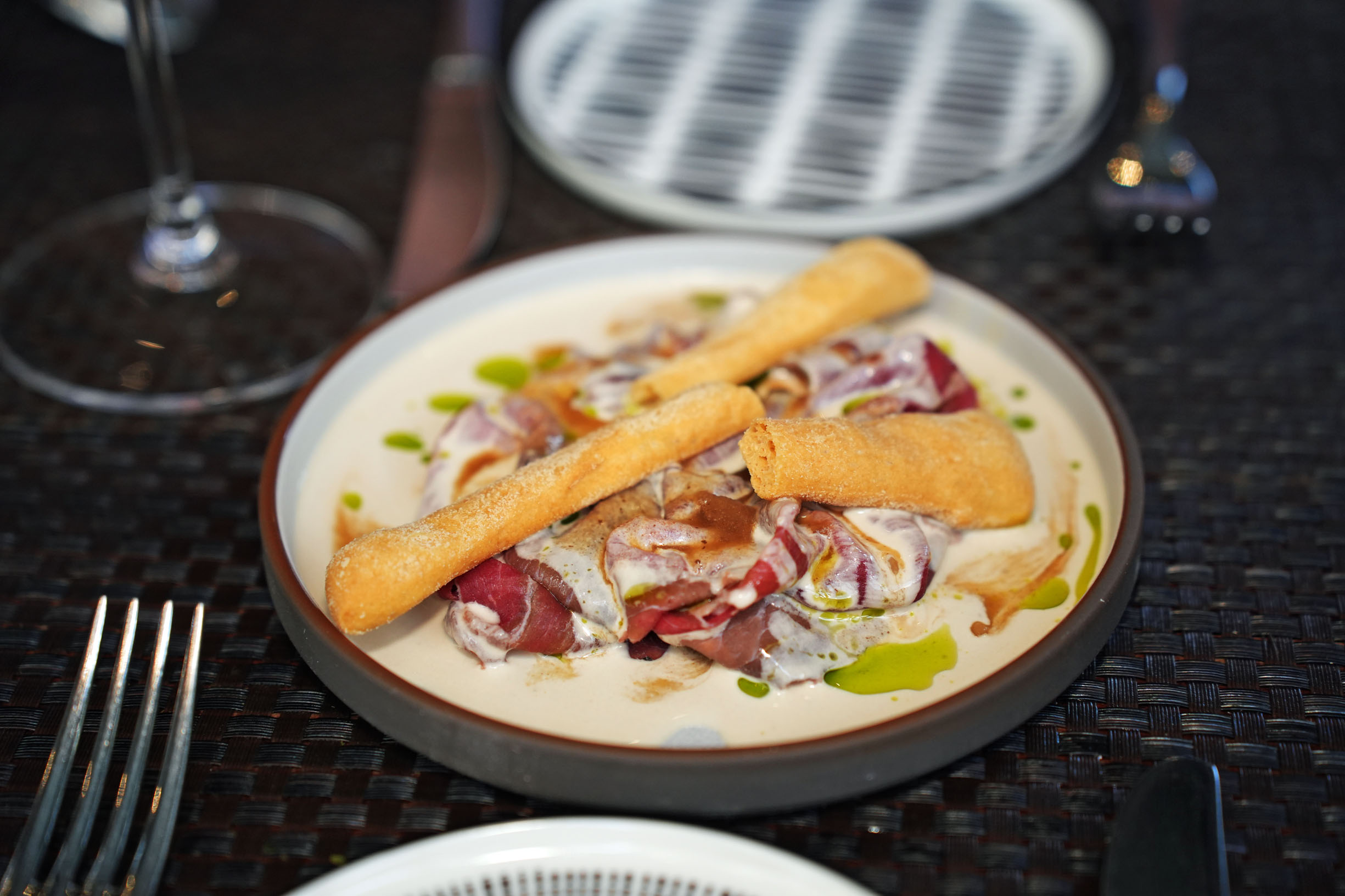 Colore Croccante from the meat menu is a bursting with freshness salad of wild arugula, seasonal Jimmy Nardello peppers, charred Brentwood corn, and crispy pork belly, while Carne Salada is simply fantastical with an unusual combination of ingredients—beef carpaccio, tuna sauce with parsley infusion, and beef juice.