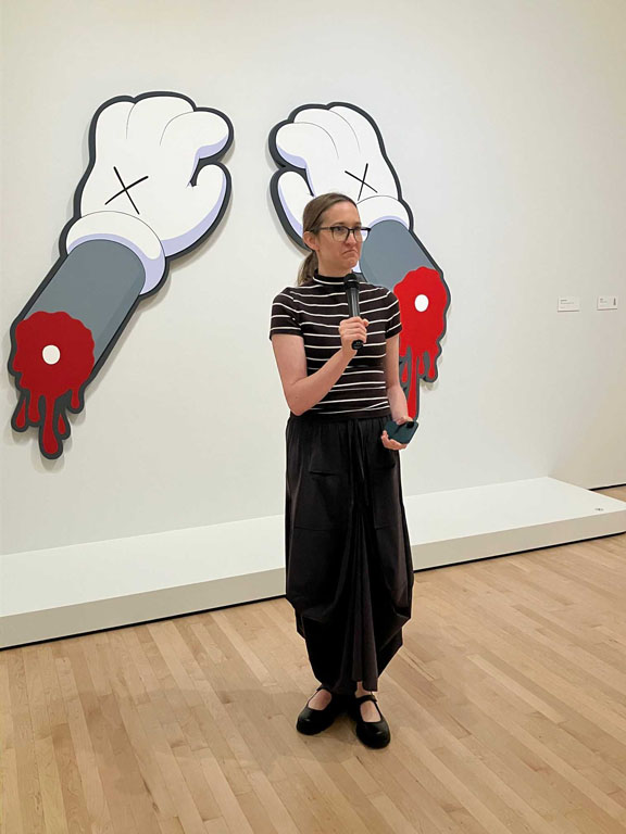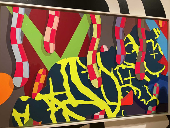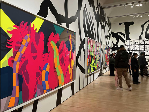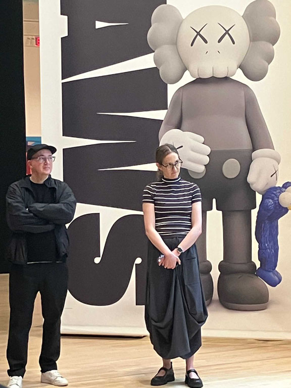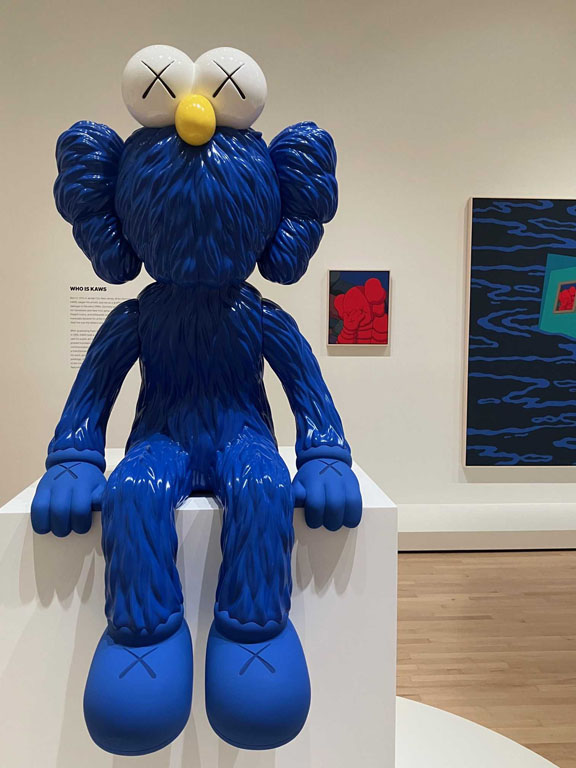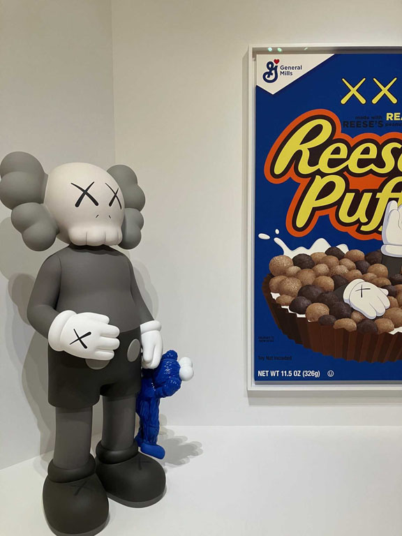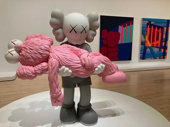 On view through May 3, 2026, the exhibition includes several large-format sculptures of cartoonish figurines with KAWS’s signature crossed-out “dead eyes,” fluffy mouths and protruding oversized ears alongside the same-subject smaller figures and drawings, some abstract paintings, commercial projects, and the artist’s take on the pop culture iconic American sitcom “The Simpsons” renamed “The Kimpsons” for the occasion.