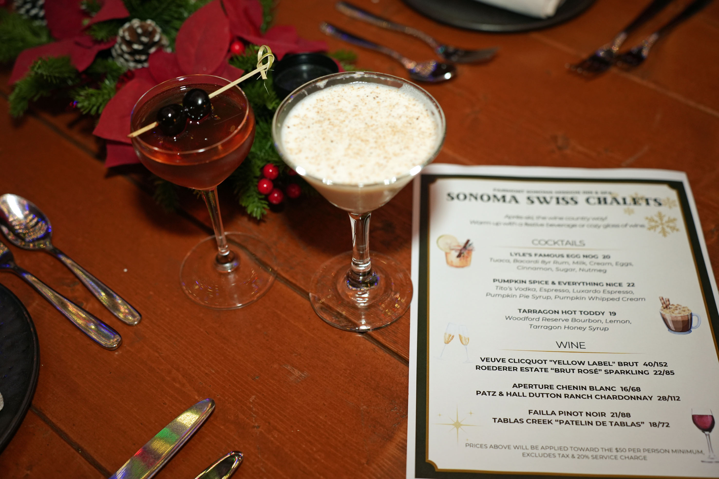 Sonoma Swiss Chalets are all set up for your party of 2-8 guests to indulge in holiday-inspired cocktails during Happy Hour or a delicious thematic dinner. A signature a la carte Chalet Menu includes festive winter beverages, like Lyle’s Famous Egg Nog, Pumpkin Spice & Everything Nice, and Tarragon Hot Toddy along with Veuve Clicquot champagne, Aperture Chenin Blanc and Filla Pinot Noir.