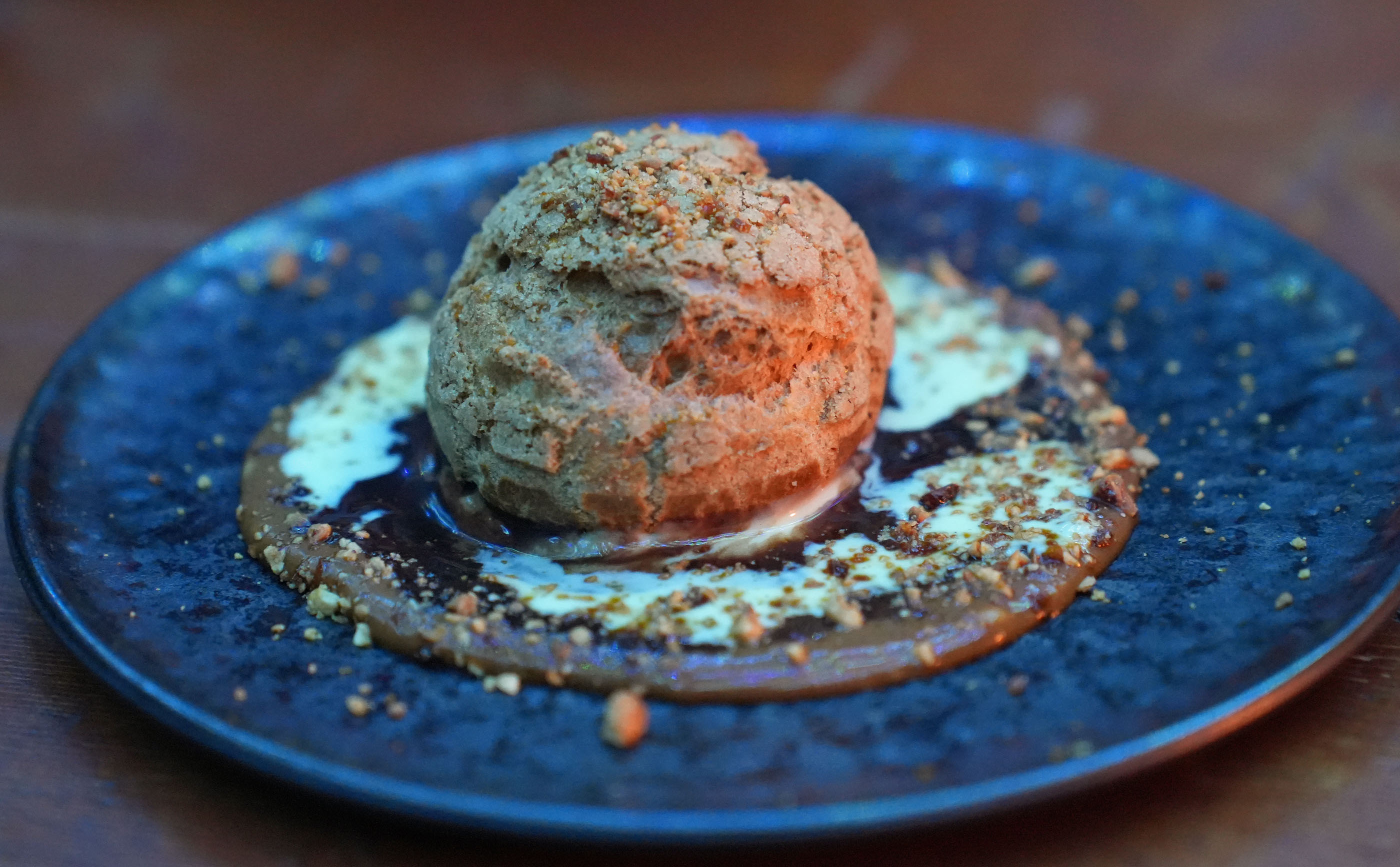 Chocolate Hazelnut Profitrole for dessert has a delicate cream filling, and is served on a bed of caramel and chocolate sauce with crème Anglaise, and sprinkled with candied hazelnuts.