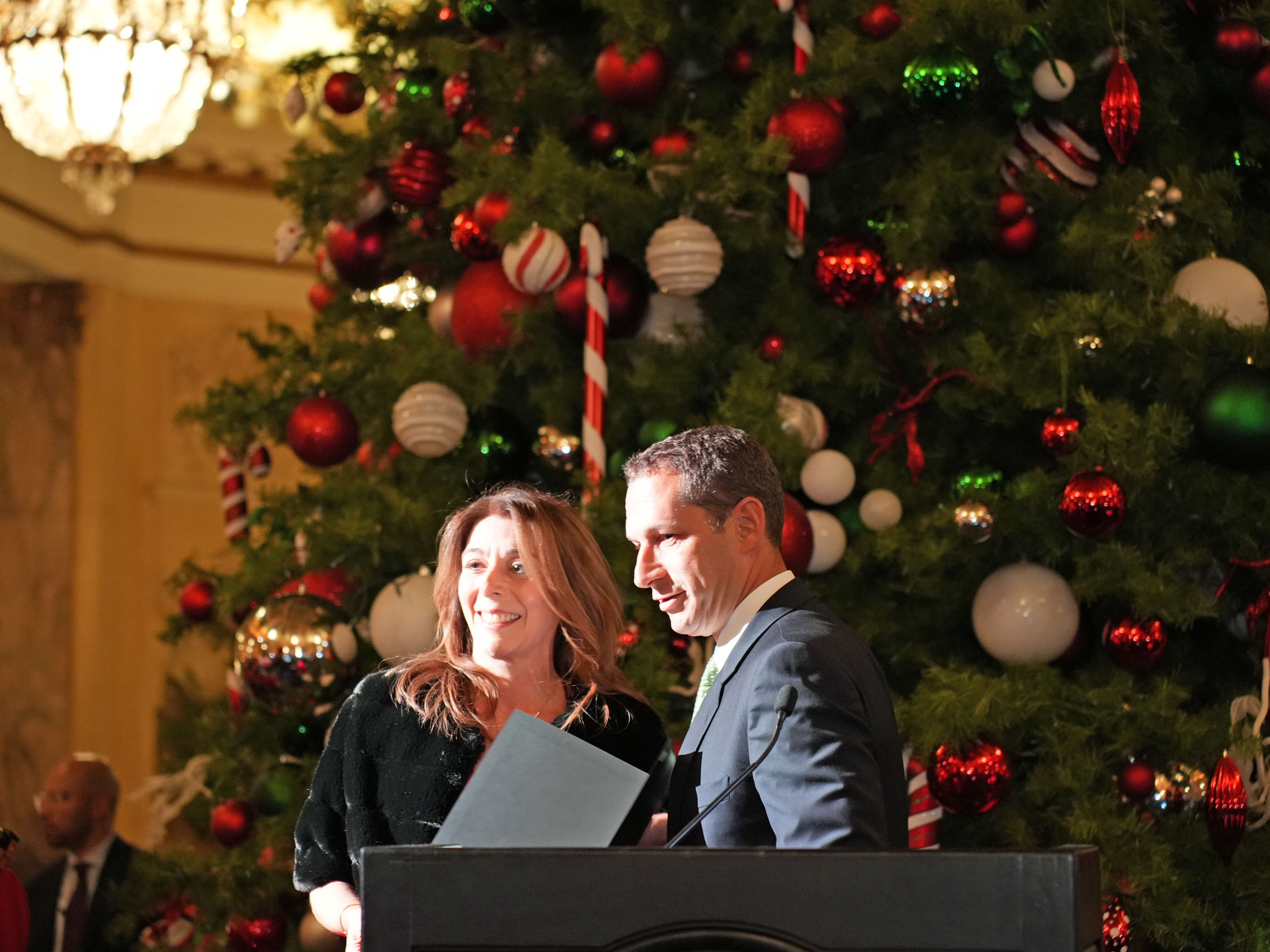 Daniel Lurie, the Mayor of San Francisco, and Angie Clifton, the first woman General Manager in the Palace Hotel’s history, spoke at the event, where the guests were treated to hot beverages, sweets, and a live band music with a singer.