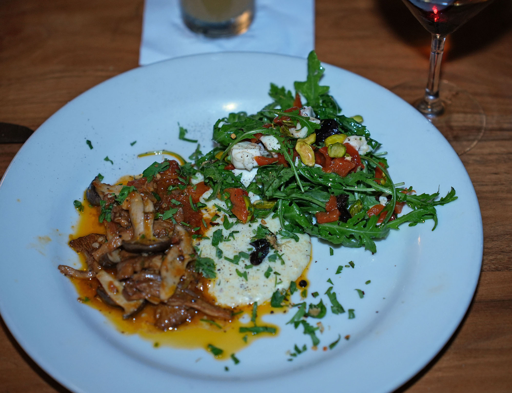 For dinner, Chef Kantor, a pioneer of California’s farm-to-table movement, treats his out-of-town guests and local regulars to the region’s seasonal bounty, like the foraged wild mushrooms, prominent in quite a few dishes. Wild Mushroom Ragu with pomodoro sauce, mascarpone polenta, mozzarella, roasted peppers, and black olives makes a zesty, piquant starter. Pan Roasted Niman Ranch Pork Chop with pumpernickel spaetzle, garlic fried Brussels sprouts, and whole grain mustard is one of the star entrees, while daily changing soups and housemade pastas provide additional variety to the already rich with choices and flavors menu.