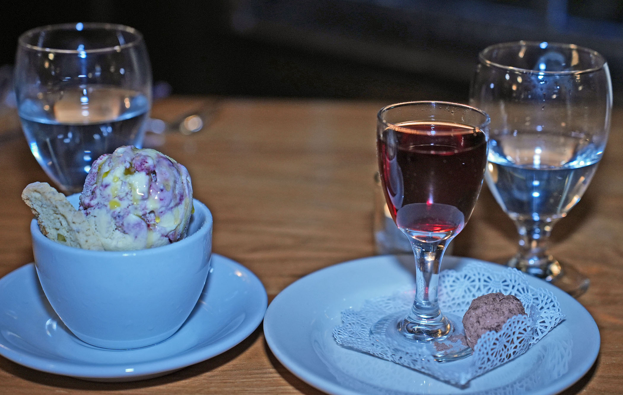 While the fantastic dessert selections include a lavish Chocolate Extravaganza of chocolate pecan torte, bourbon maple crème Anglaise, chocolate cabernet cherry truffle and chocolate salted caramel swirl ice cream; freshly made Apple Beignets, served with cinnamon ice cream, salted caramel sauce, and toasted walnuts, and other amazing choices, the restaurant’s housemade ice creams are a sufficient treat on their own. I won’t soon forget my Fromage Blanc Ice Cream with Blackberry Sorbet made of locally harvested berries, and pistachio biscotto.