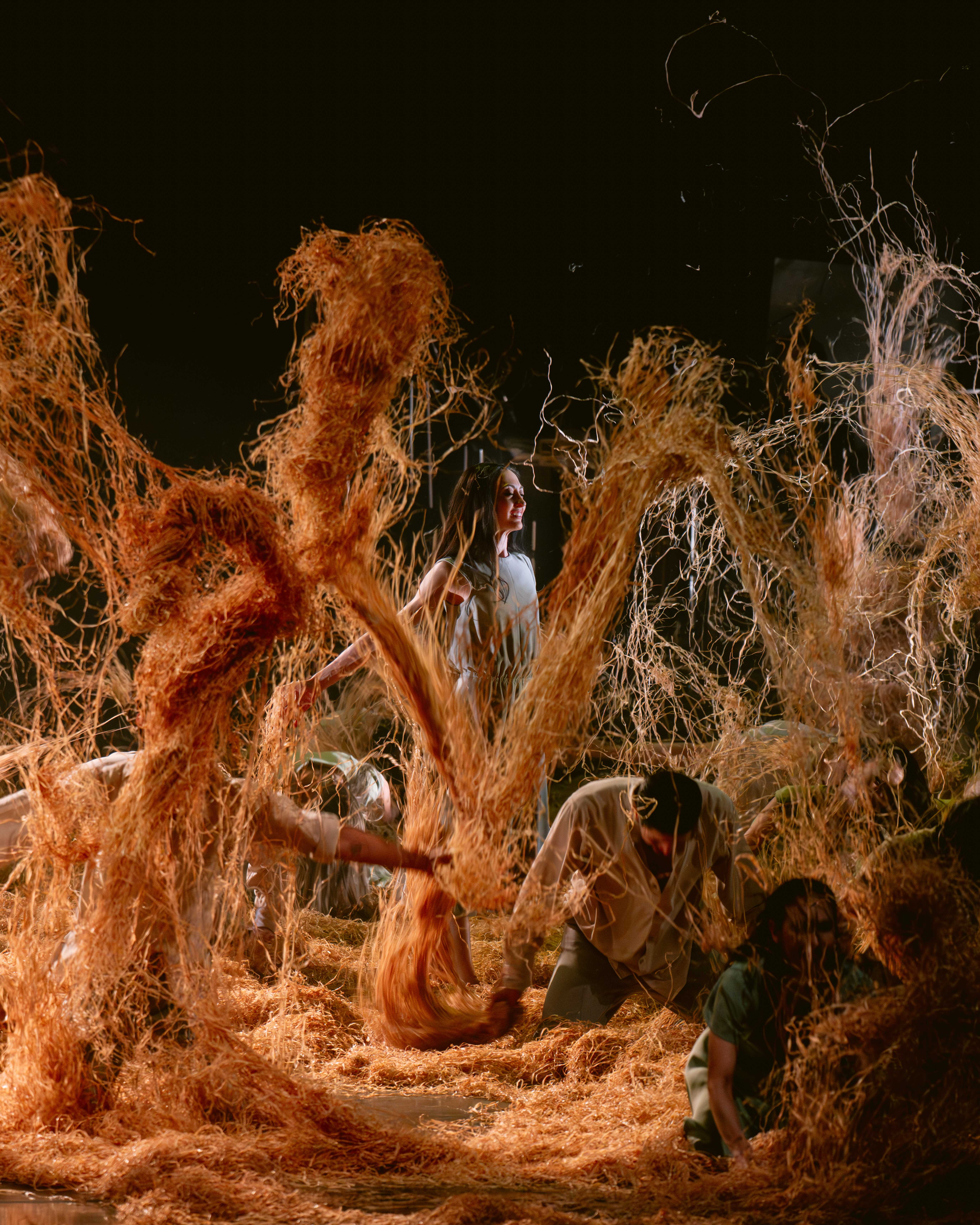 Live accompaniment musicians, half-hidden in the dark depth of the stage, provided an incomparable feeling of immediacy, playing two violins (Dovid Friedlander, Janis Sakai), viola (Beatrice Chen), cello (Mara McClain), piano (Jorge Ivars), and percussion (Niklas Brommare).