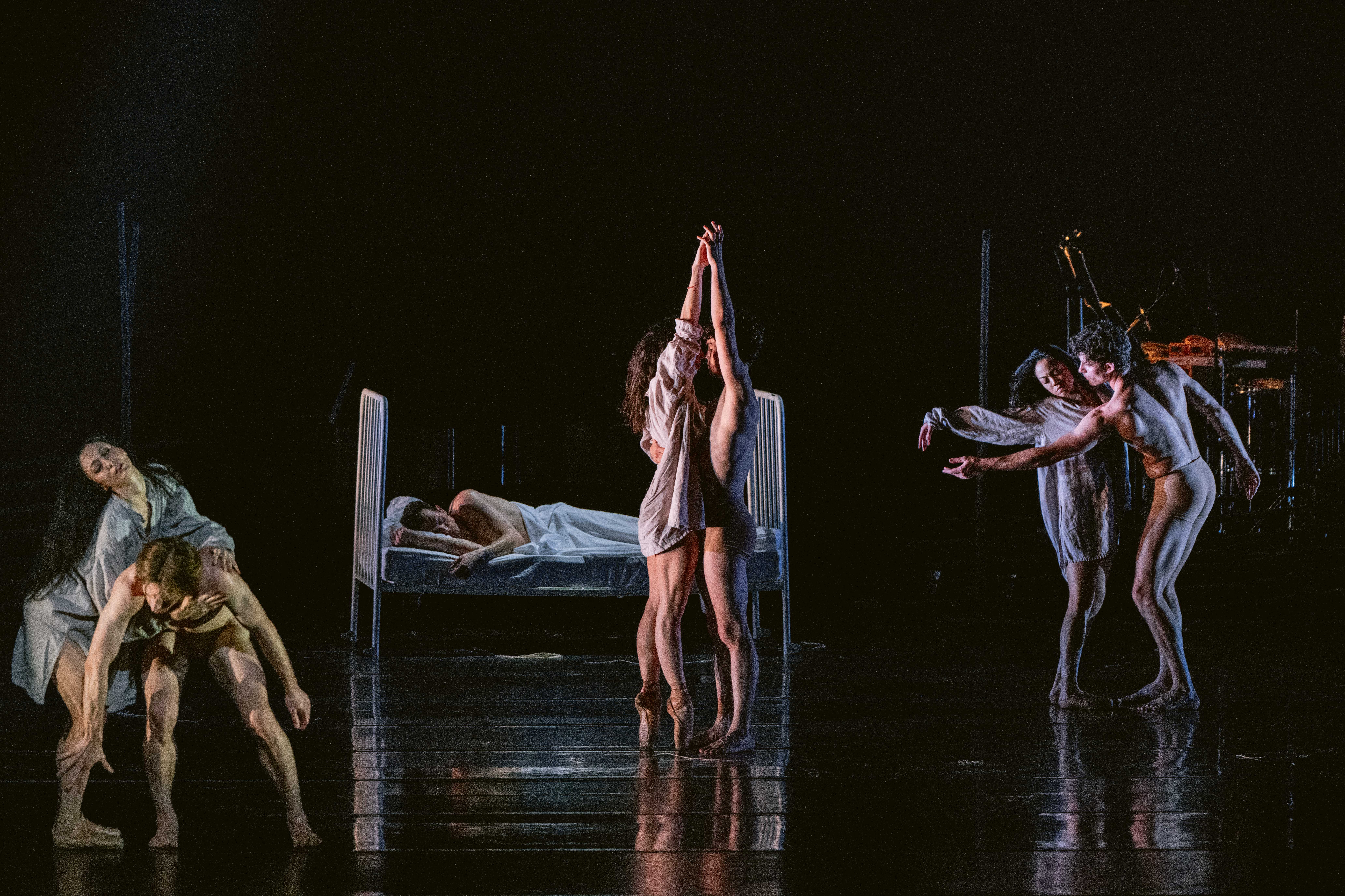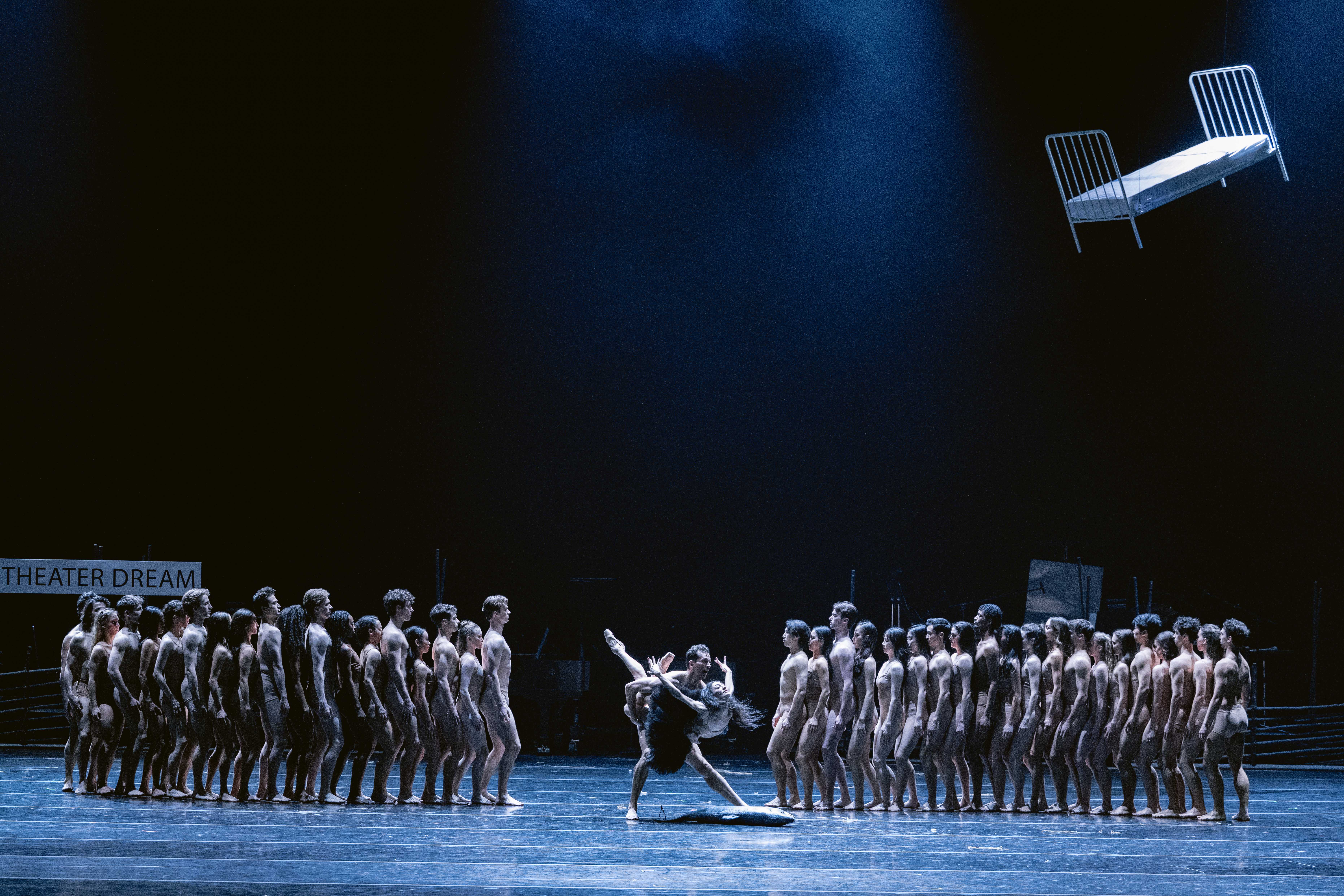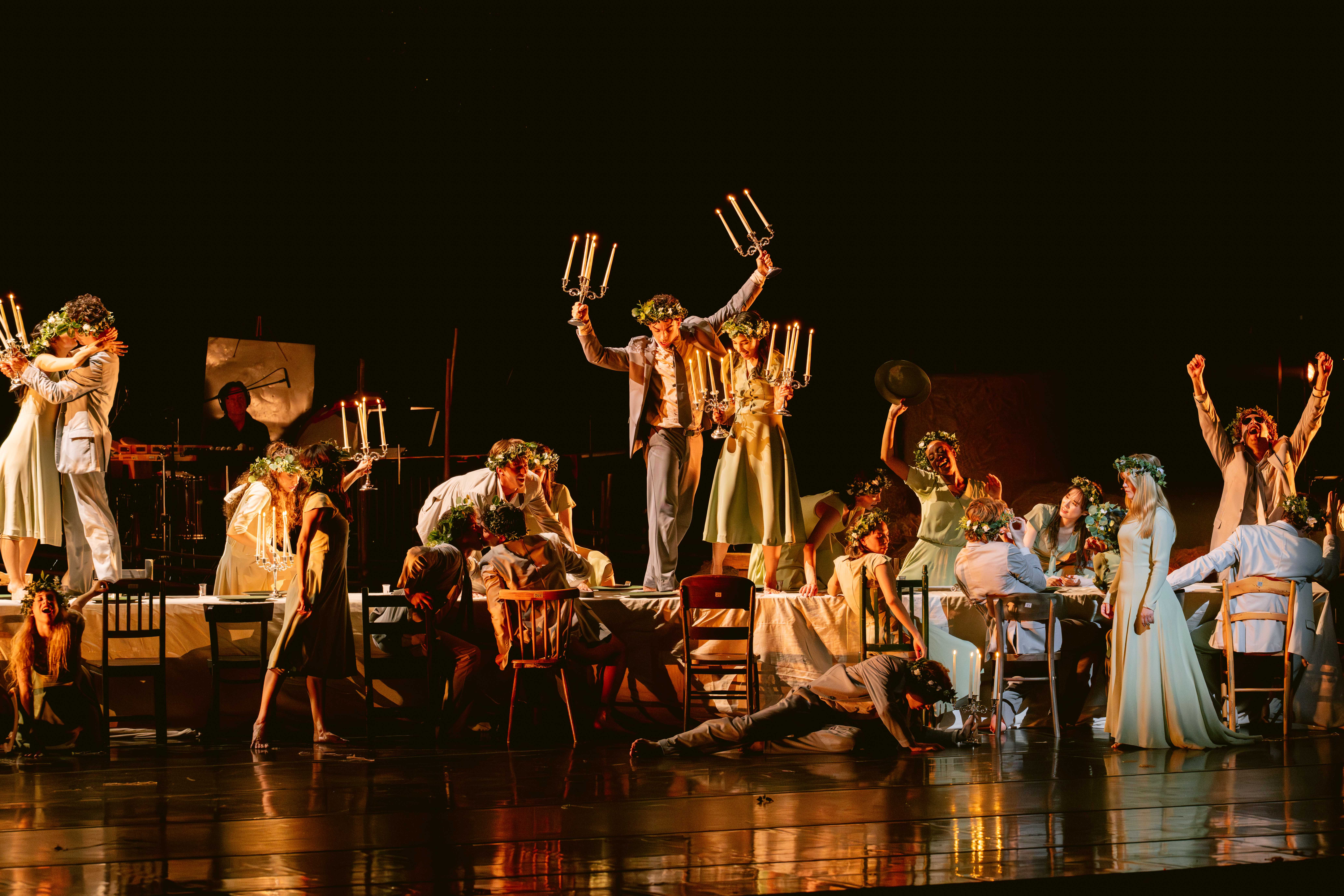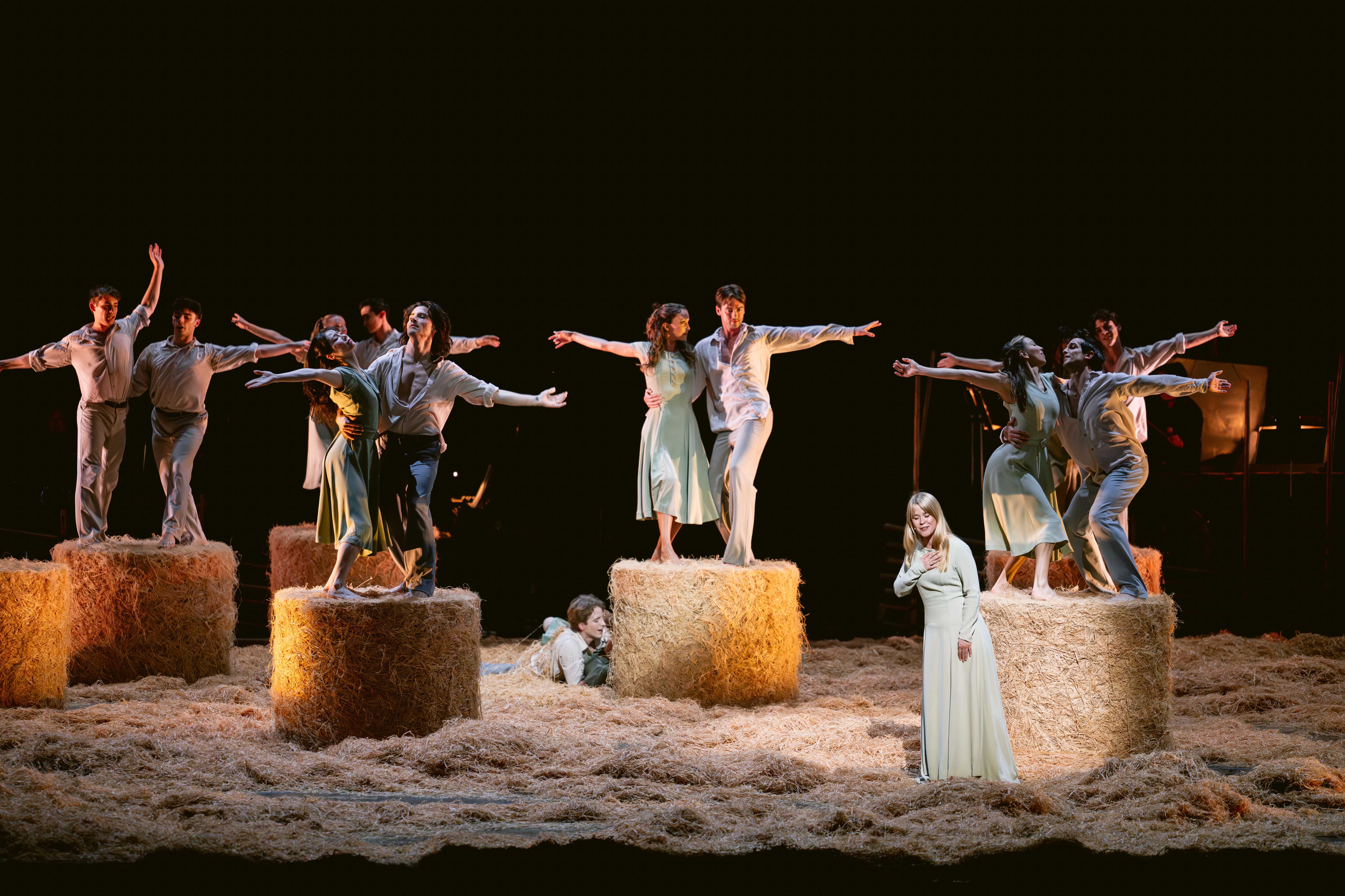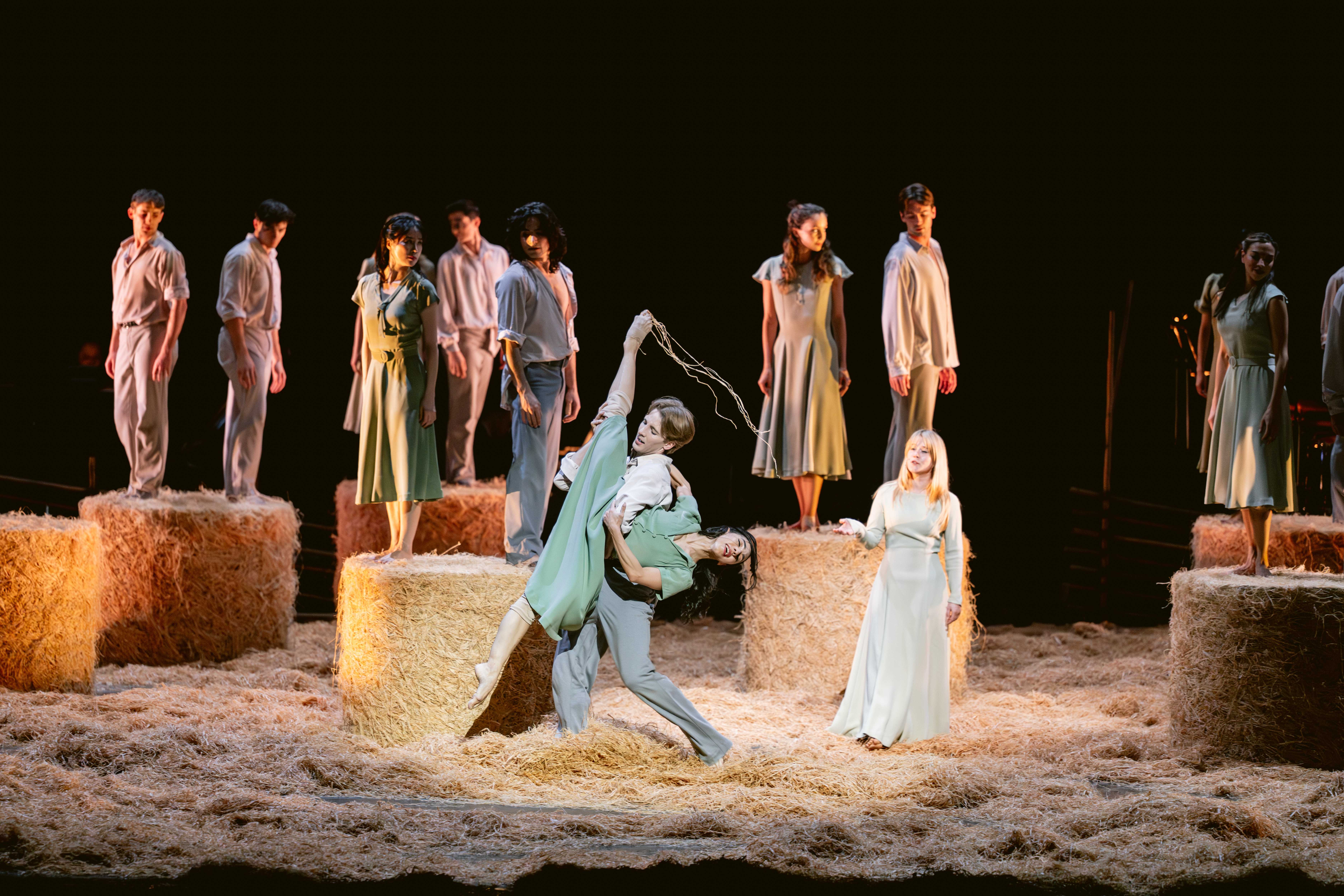 Hay (as in “rolling in hay”) plays a big role in the first act of the show, making waves under a traditional maypole, around which the impeccable Joffrey Ballet dancers, crowned with flowers, fill the stage with their high-voltage energy and outstanding technical skill. The longest day of the year turns into night, the endless libations continue by candlelight, and in the second act The Dreamer (Dylan Gutierrez) and The Hostess (Victoria Jaiani) engage with their “real-life” friends as well as with fantastical figures of Lovers (Amanda Assucena, Stefan Gonçalvez), Two Friends (Assucena, Jeraldine Mendoza), Mr. Canon (Xavier Núñez), A Bubbler (Hansol Jeong), A Chef en pointe (Fernando Duarte), A Man with a Flag (Scott Reed), Headless Men (Edson Barbosa, Aaron Renteria), and multiple “guest” characters, wonderfully synchronized and performing at the height of inspiration.